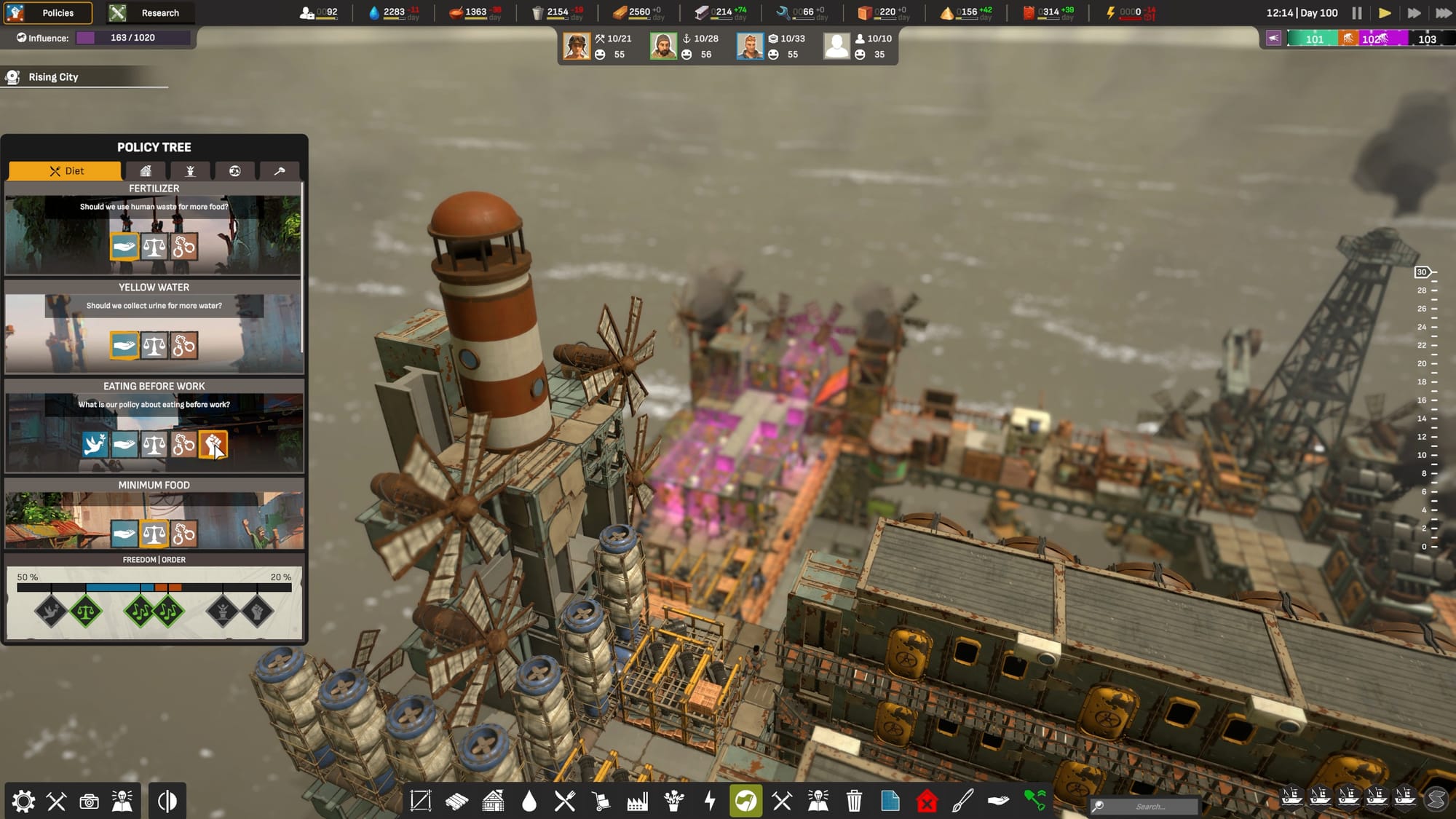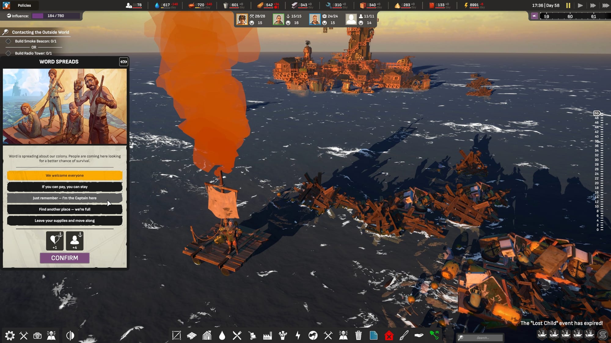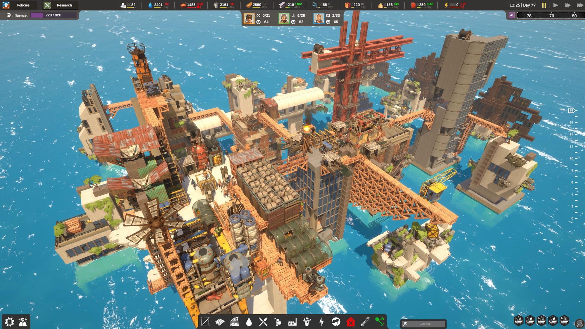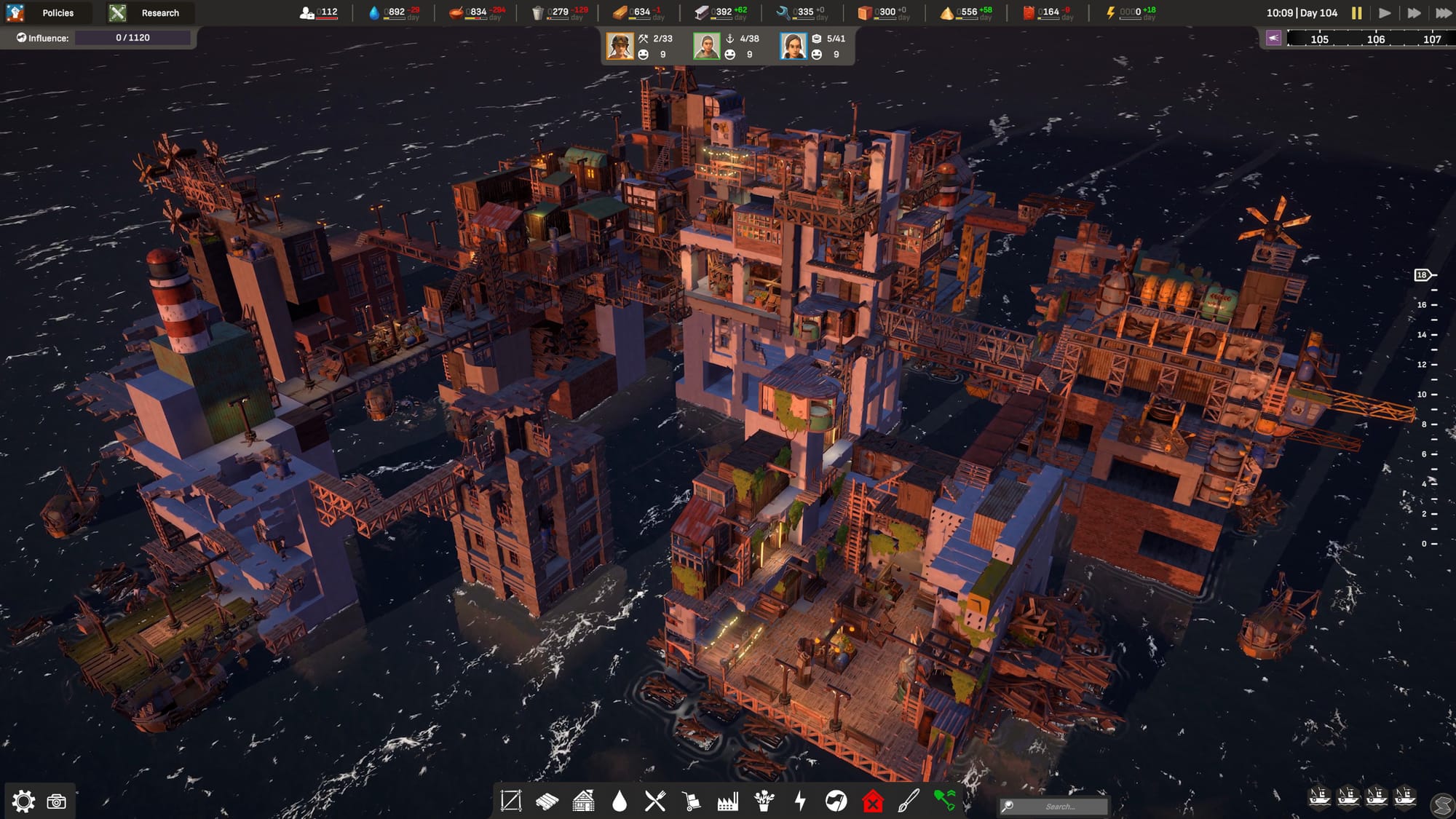 Apart from the 3D building system, the game features survival and city-building elements. When constructing the city, players progress through the research tree to unlock various buildings, such as rain collectors, furnaces, radio masts, lighthouses, and dynamo hamster wheels for generating electricity. Players must scavenge for resources, explore the ocean and make difficult but necessary decisions to ensure the survival of their colony. They must also manage a colony of survivors and navigate the wants and needs of different factions, such as Engineers, Sailors and Workers. Each faction has its own unique traits, duties and bonuses when satisfaction is high. Sometimes difficult but necessary decisions must be made, such as rationing food during a shortage or dealing with civil unrest. Then there are lightning storms, political coups, and unexpected newcomers. The question is: benevolent shepherd or harsh tyrant? However, this social aspect of the game is not as well developed as in other titles, such as Frostpunk, and does not have as much of an impact in the long term. It is also worth noting that although the resource scarcity is challenging, it is not frustrating. The learning curve is relatively gentle.