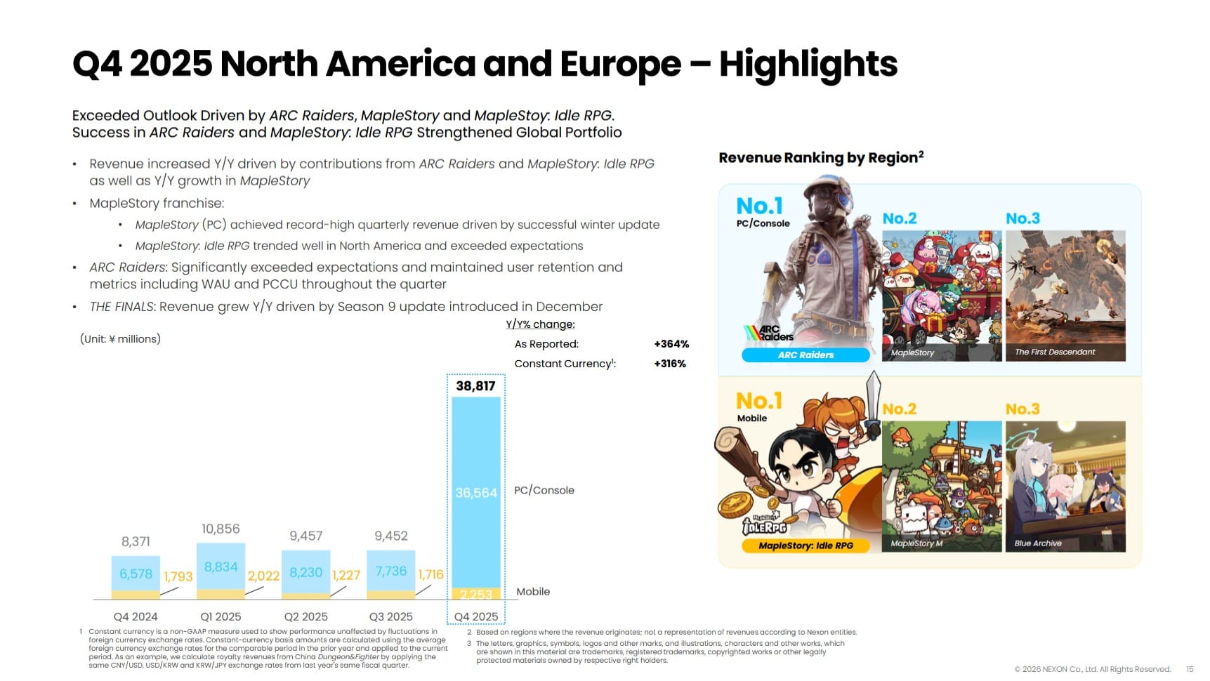 "We are extremely pleased to report record-breaking revenue for full year 2025," said Junghun Lee, President and CEO of Nexon. "Arc Raiders, the biggest new game launch in Nexon’s history, is still growing and sustaining engagement 15 weeks after the October launch. The game has exceeded our most optimistic projections, with a record 960,000 peak concurrent users in January, and more than 14 million units sold to date. Beyond the metrics, Arc Raiders is a proof point in our global expansion strategy, demonstrating Nexon has the creative teams, operating model, and live operations capability to sustain global releases at scale. Together with our proven ability to renew and grow core franchises, we have entered the new year as a more diversified, durable, and globally competitive company."