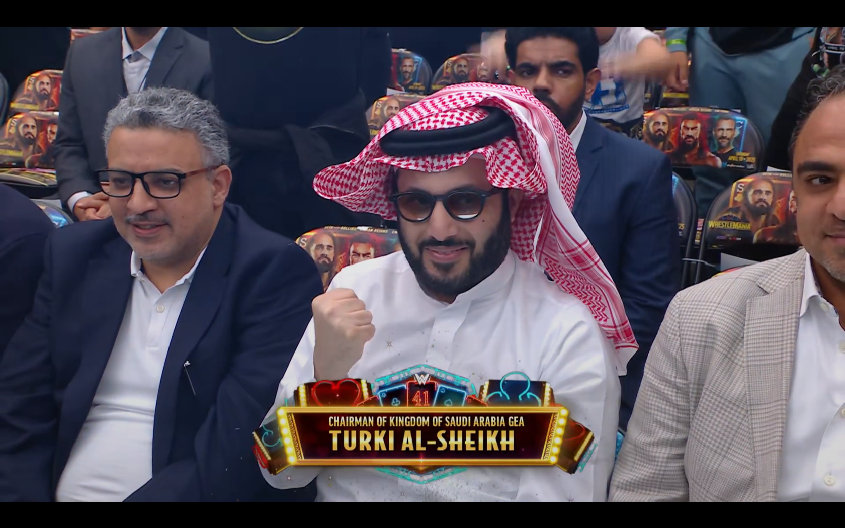 The answer becomes obvious with a look at one prolific guest in the audience, as well as connecting him with SNK and WWE's increasing business ventures in Saudi Arabia. Sitting in the first row and lauded by the announcers during the first minutes of the show was Turki bin Abdul Mohsen Al-Sheikh, diplomat and representative of the autocratic monarchy of Saudi Arabia. A monarchy spearheaded by Crown Prince and Prime Minister Mohammed bin Salman, open fighting game super fan, and holder of 96 per cent of a certain fighting game company called SNK through his own Mohammed bin Salman (MiSK) Foundation. The very same company that bought the most prominent ad space of WrestleMania 41.