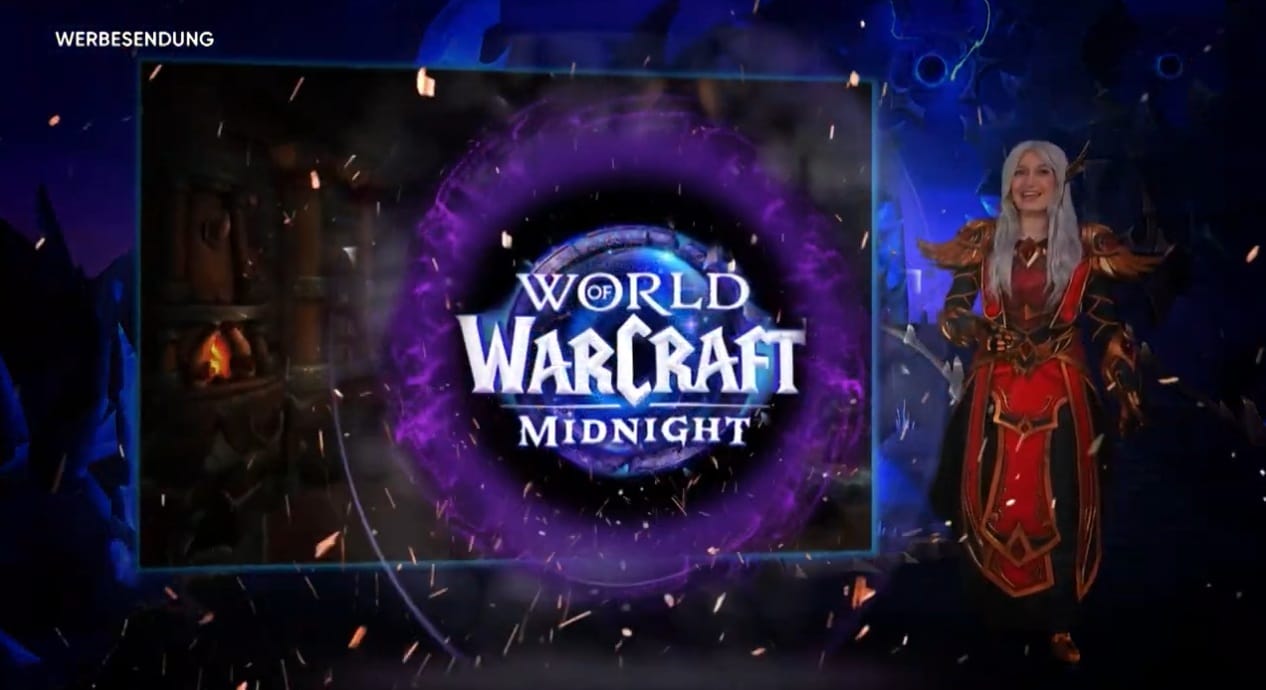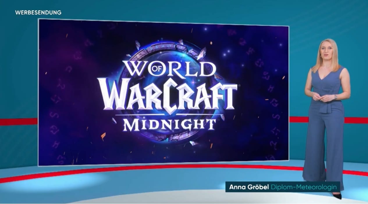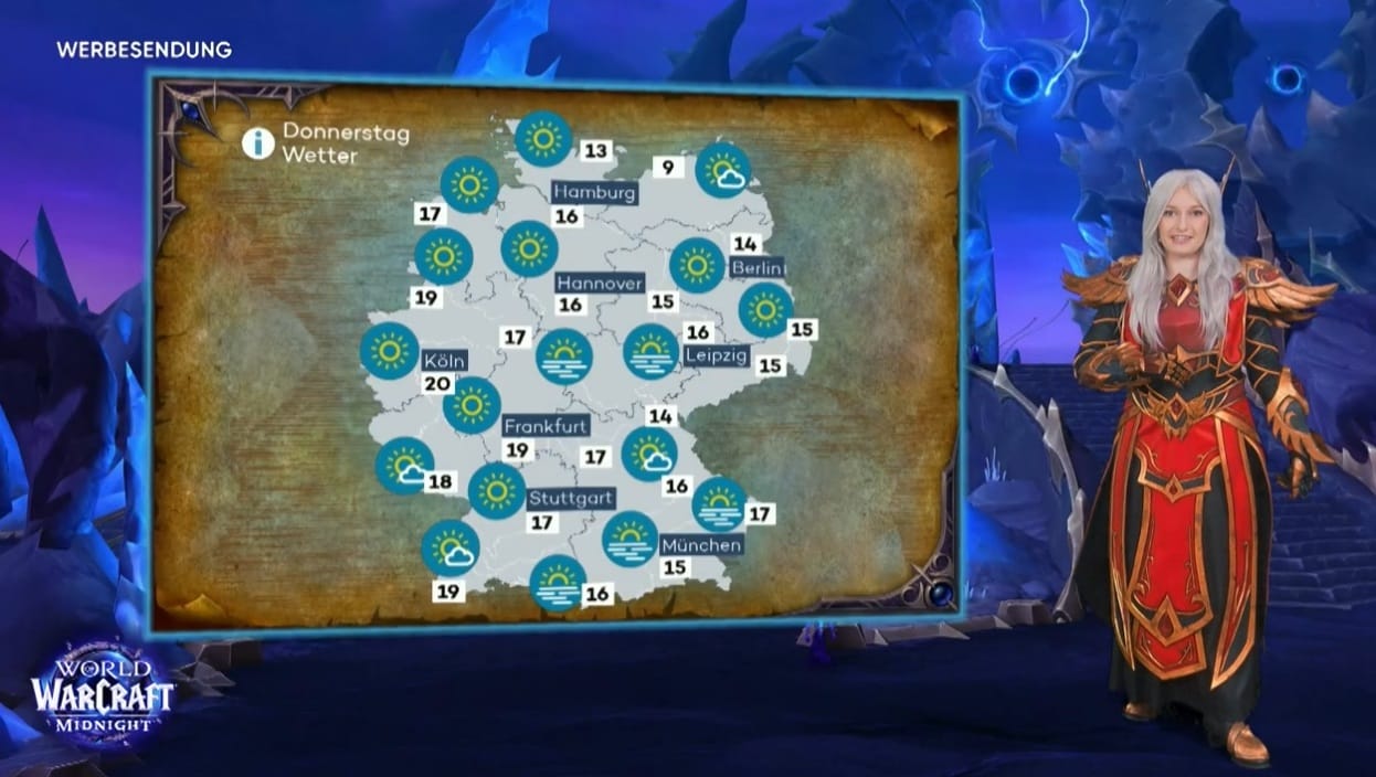 From 3 to 5 March 2026, the weather forecast on Pro7 was presented together with advertisements for World of Warcraft: Midnight, with promotions for Blizzard Entertainment's eleventh expansion of the MMORPG preceding and following the weather report. Presenter Anna Gröbel wore a custom-made Blood Elf costume created by cosplayer Cinderys while introducing Midnight features and presenting the game world of Azeroth.