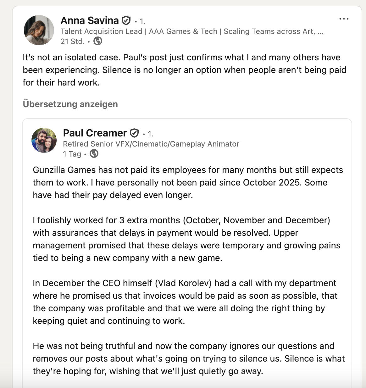 “It’s not an isolated case. Paul’s post just confirms what I and many others have been experiencing. Silence is no longer an option when people aren't being paid for their hard work.” Anna Savina, former Talent Acquisition Lead at Gunzilla, chimed in in a LinkedIn comment on Creamer’s post as well. Her posts were some of the first to gain public attention on the matter, after she quit her job at Gunzilla GmbH in mid-March 2026.