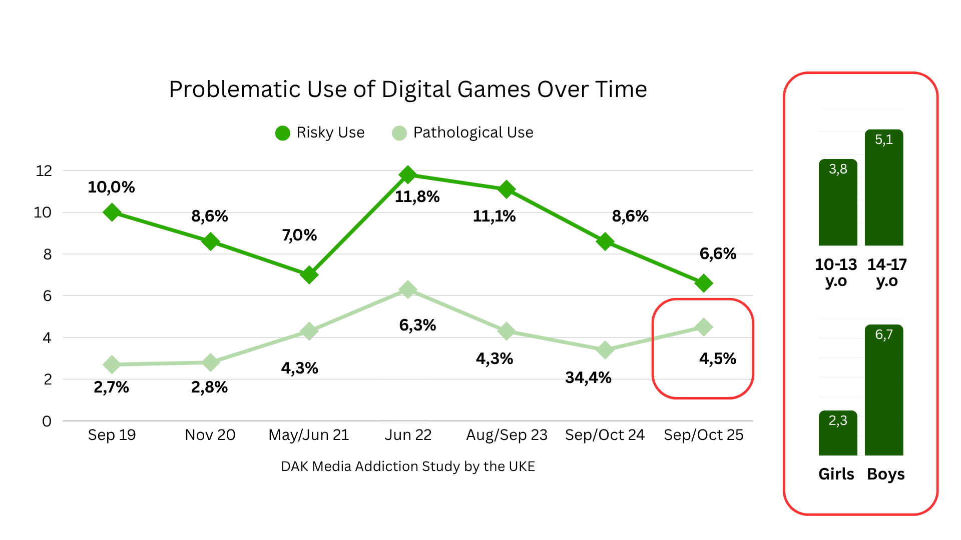 It is interesting to note that the percentage of gaming use classified as ‘at-risk’ according to the ICD-11 criteria continues to fall, and significantly so. It currently stands at just 6.6%. This, too, is the lowest figure since the survey began in September 2019. Contrary to this trend, however, the proportion of pathological use rose from 3.4% to 4.5%. According to the study, boys in particular are prone to pathological gaming. In its 11th edition of the International Classification of Diseases (ICD), the WHO classified gaming disorder as an addiction and established criteria for identifying problematic and pathological gaming behaviour.