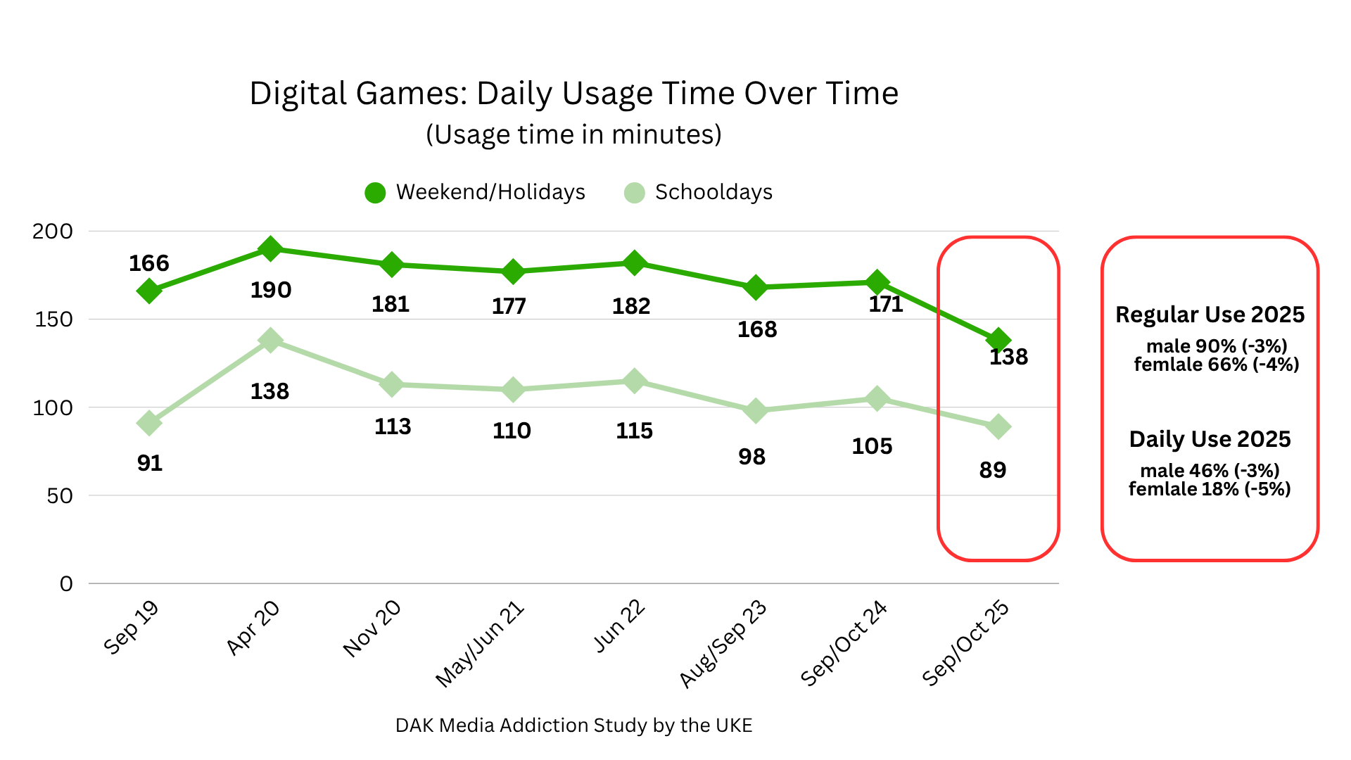 Unlike in previous years, when they were barely mentioned, digital games are highlighted in the press release, and their use is also examined. This reveals a continuing downward trend, which is hardly likely to make for negative headlines. The use of digital games on school days fell to 89 minutes and to 138 minutes on weekends or during holidays. In both cases, the figures are thus below the 2019 result for the first time – that is, from before the pandemic, when the use of games shot up significantly. For comparison: according to the DAK study, the duration of social media use is 201 minutes at weekends and 146 minutes on school days. The duration of online video use is 151 minutes at weekends and 108 minutes on school days.