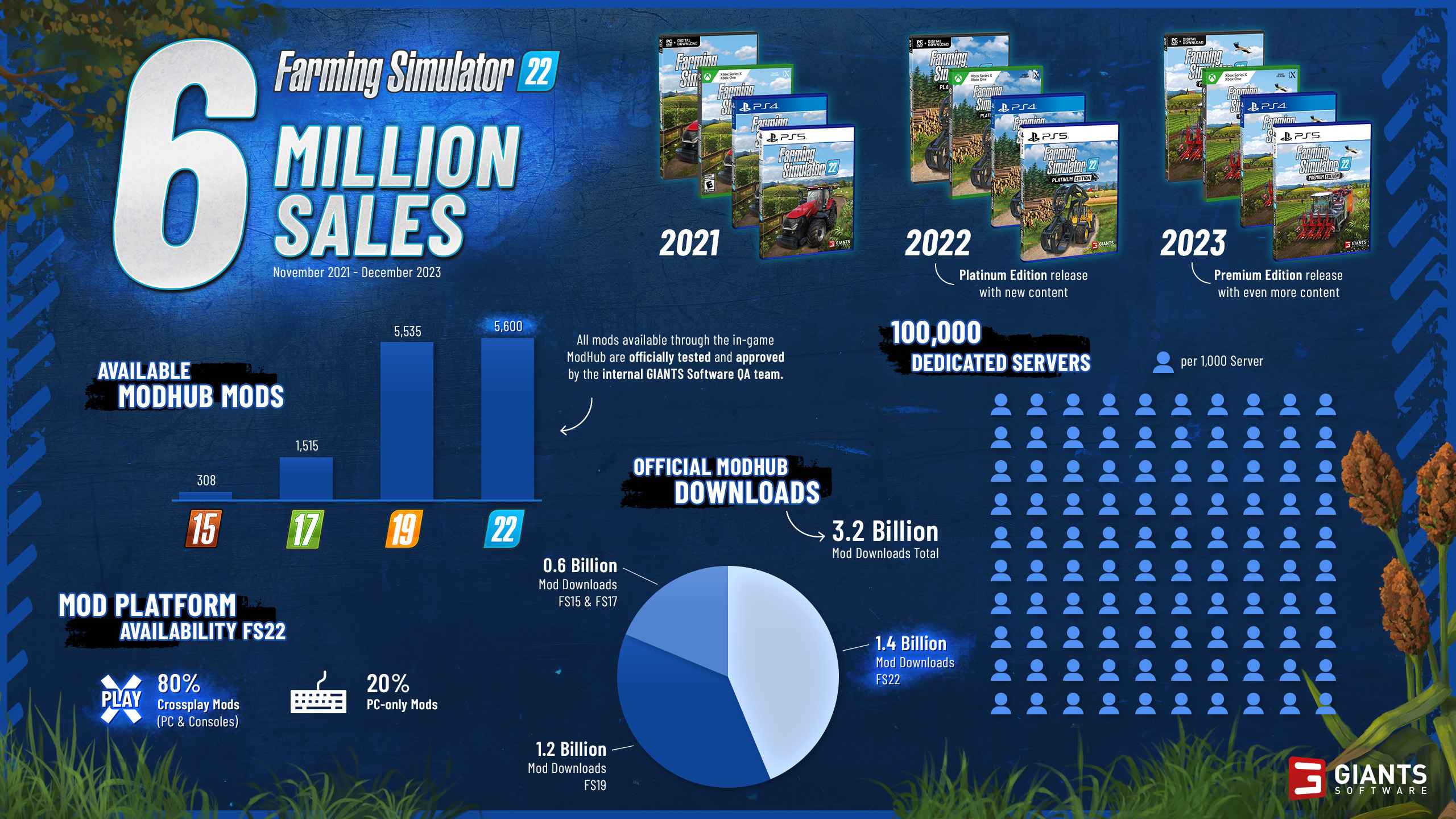 Giants Software meldet mehr als sechs Millionen verkaufte Exemplare vom "Landwirtschafts-Simulator 22" bzw. "Farming Simulator 22", Platinum Edition und Premium Edition aus dem vergangenen Jahr inbegriffen. Der im November 2021 erstveröffentlichte Teil ist damit der erfolgreichste Vertreter der Reihe. Der "LS22" war zudem der erste Teil, den Giants Software als Publisher selbst veröffentlicht hat, wobei sie in Deutschland mit astragon Entertainment und weltweit mit zahlreichen anderen Distributionspartnern zusammengearbeitet haben.