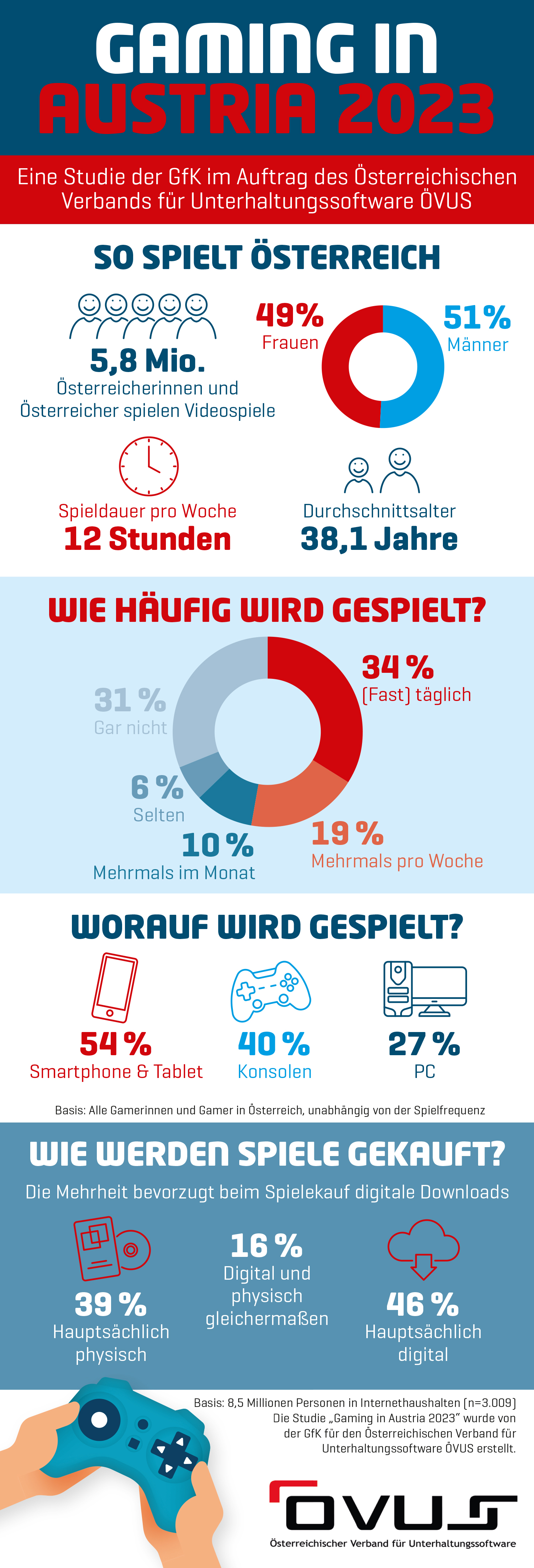 5,8 Millionen Österreicher:innen spielen Videospiele – und damit eine halbe Million mehr als noch zwei Jahre zuvor. Das ist die Erkenntnis der Studie Gaming in Austria, die GfK Entertainment im Auftrag vom Österreichischen Verbands für Unterhaltungssoftware (ÖVUS) auf Basis von 3.009 Online-Befragungen durchgeführt hat. Relativ zur Gesamtbevölkerungszahl entspricht das 69 Prozent. Die Zahl der dedizierten Gamer ist ebenfalls hoch: 63 Prozent der Gesamtbevölkerung geben an, regelmäßig zu spielen.
