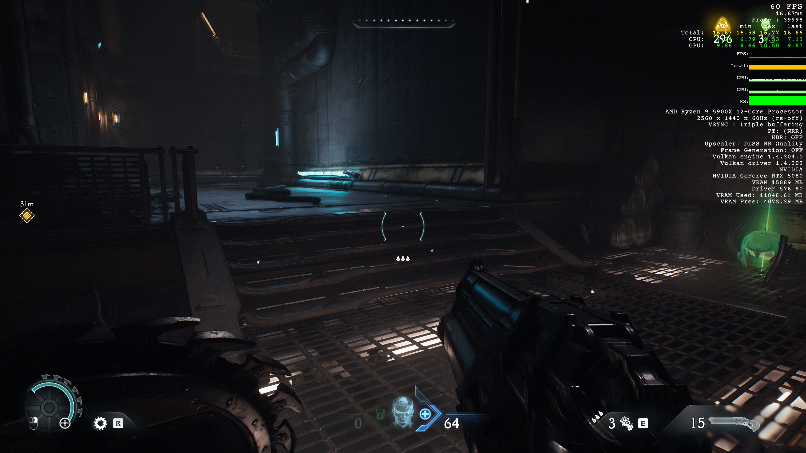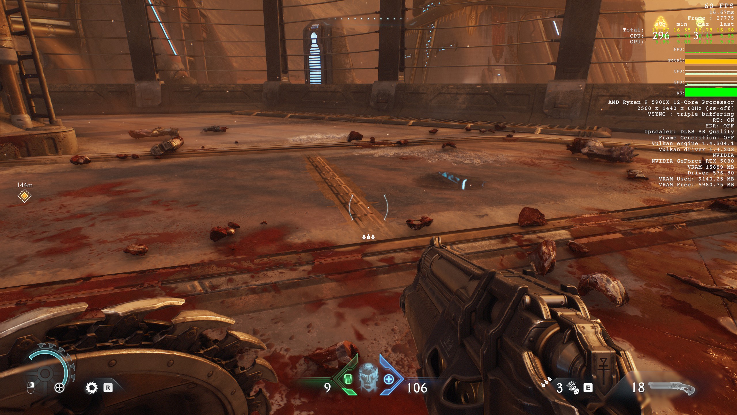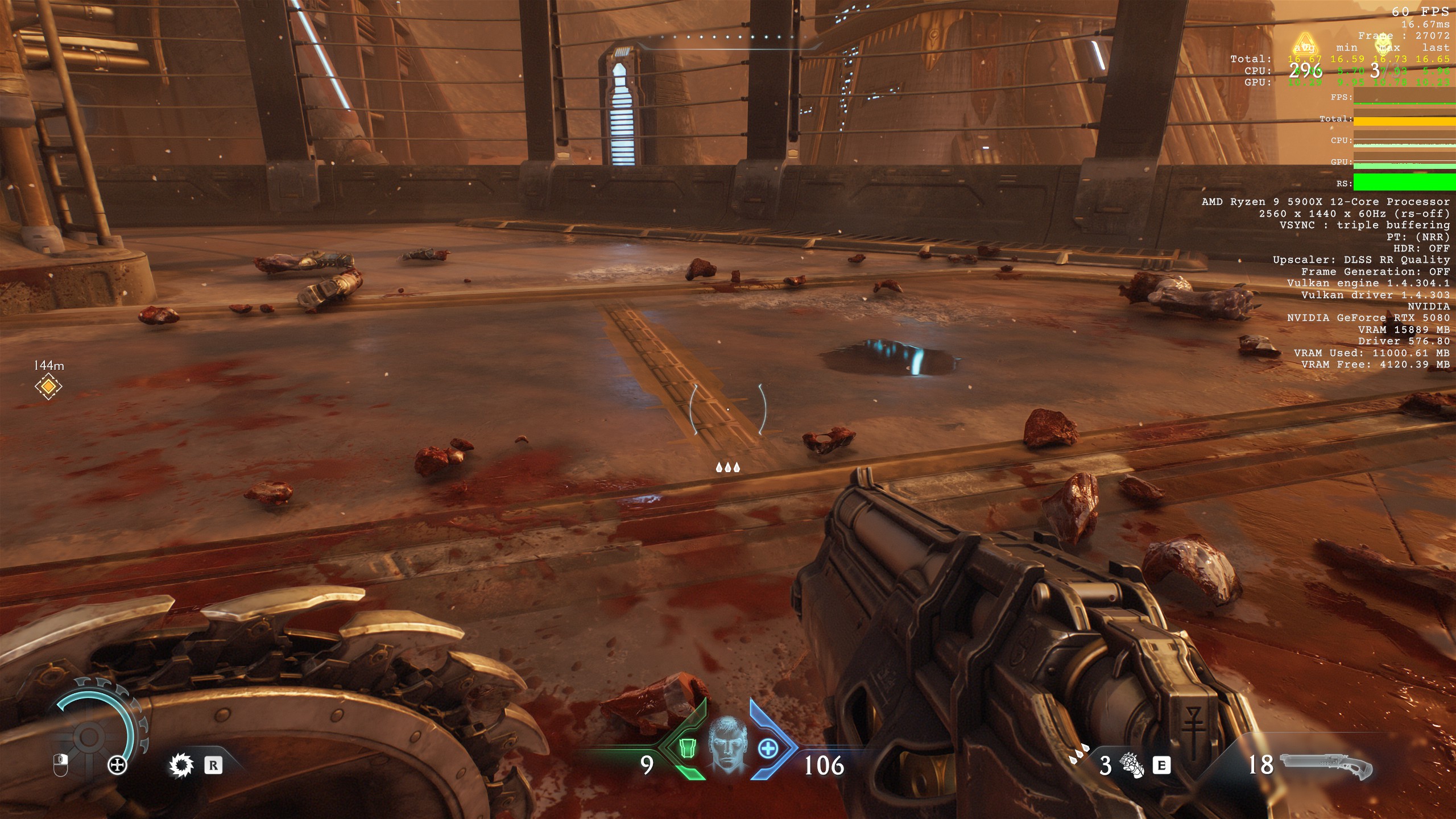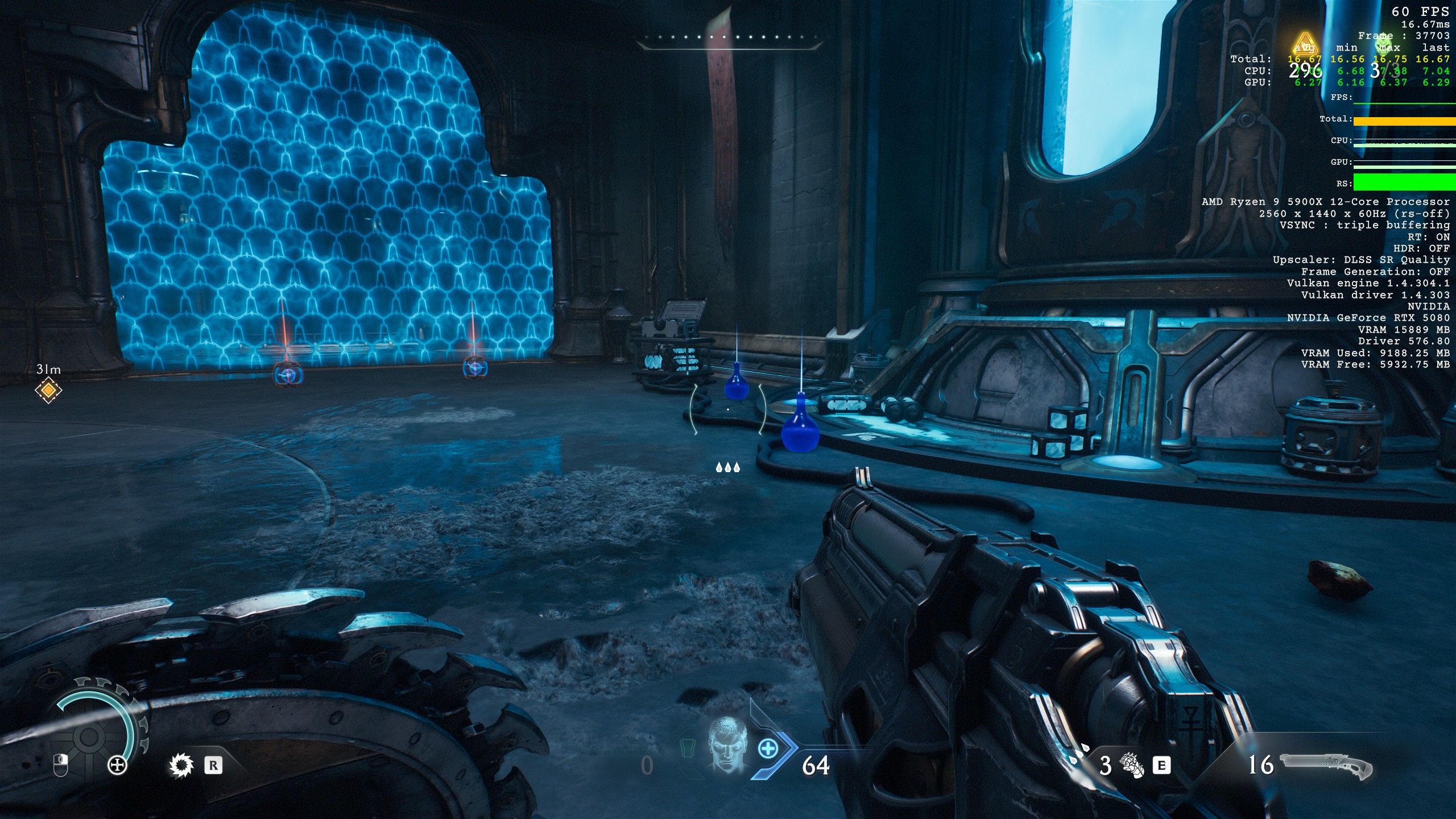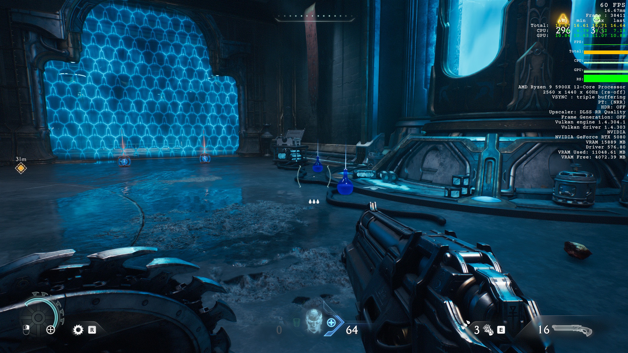 As frames calculated using Frame Generation in Doom: The Dark Ages are not included in the benchmark results, screenshots were taken at five locations with Path Tracing at 2560x1440p (DLSS quality; maximum settings) using the game's internal performance tools versus the running benchmark results.