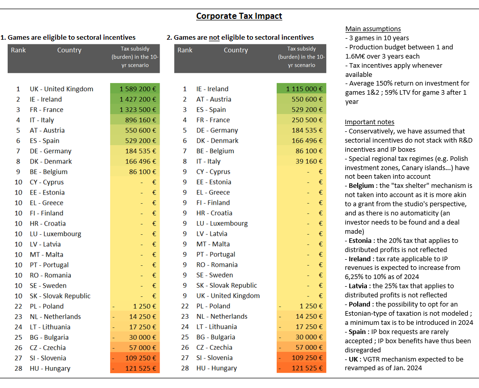 Für Produktionen, die von Gamesentwicklungsanreizen profitieren, ist das Vereinigte Königreich mit einer möglichen Maximalsumme von über 1,5 Millionen Euro Steuerrückerstattungen in einem Zehn-Jahres-Zeitraum. Auf Platz 2 folgt Irland, dann Frankreich mit jeweils knapp unter 1,5 Millionen Euro. Österreich liegt mit etwas über einer halben Million auf Platz 5, Deutschland folgt auf Platz 7, summarisch jedoch bereits weit abgeschlagen mit etwa 180.000 Euro möglicher Rückerstattung.
