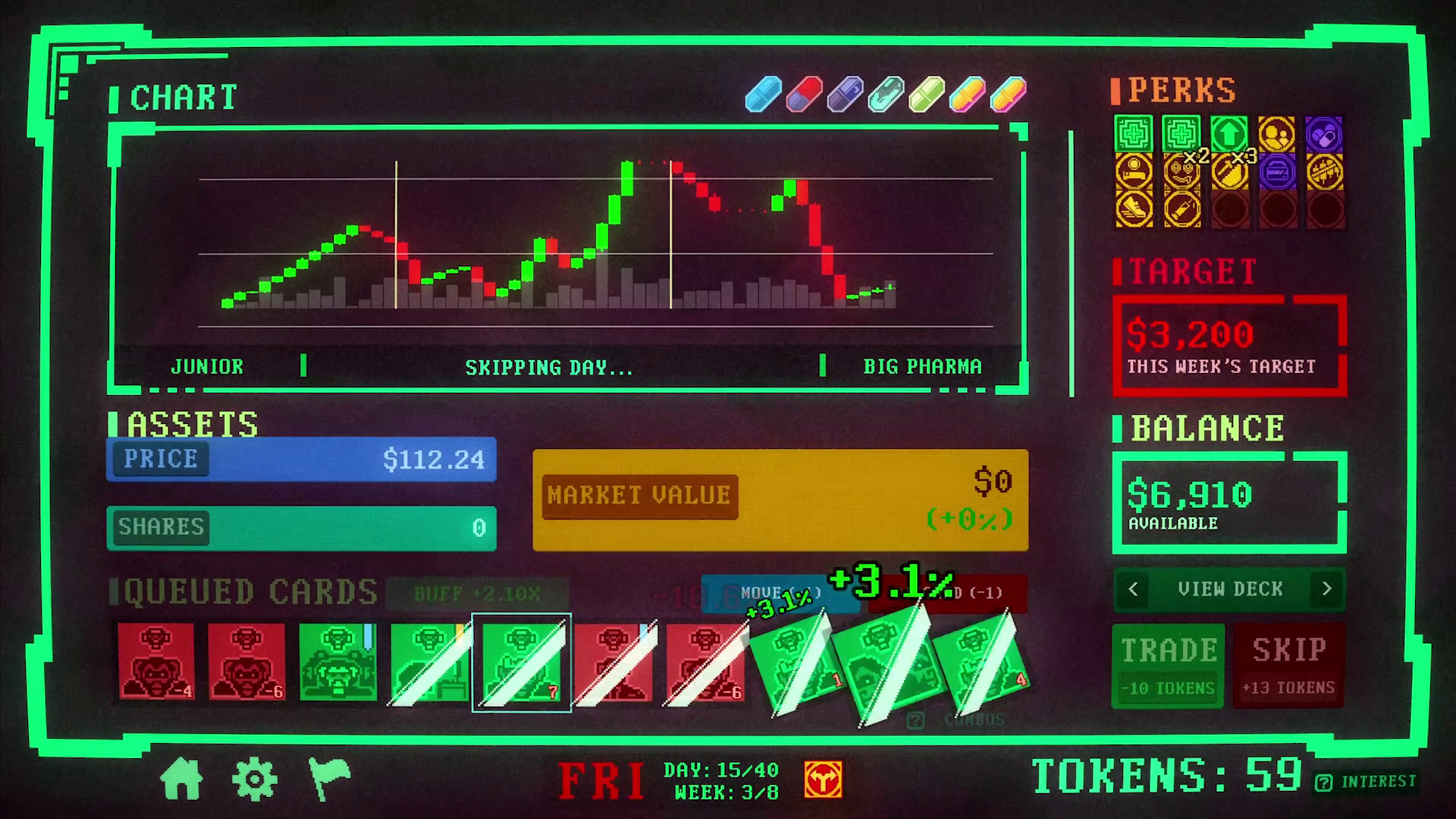 Roguelike deckbuilders cover a wide range of themes. Many are set in classic fantasy worlds, such as Slay the Spire and Monster Train, albeit with their own unique twists, but others cover completely different topics. Balatro, for example, has a poker twist; Inscryption has a psychological horror theme; StarVaders involves defending against an alien invasion with mechs; CloverPit is a horror slot machine; and 9 Kings sees players build and defend a kingdom. Insider Trading is now about manipulating the stock market. Players can spike or crash the market in order to achieve a specific financial target and avoid being fired.