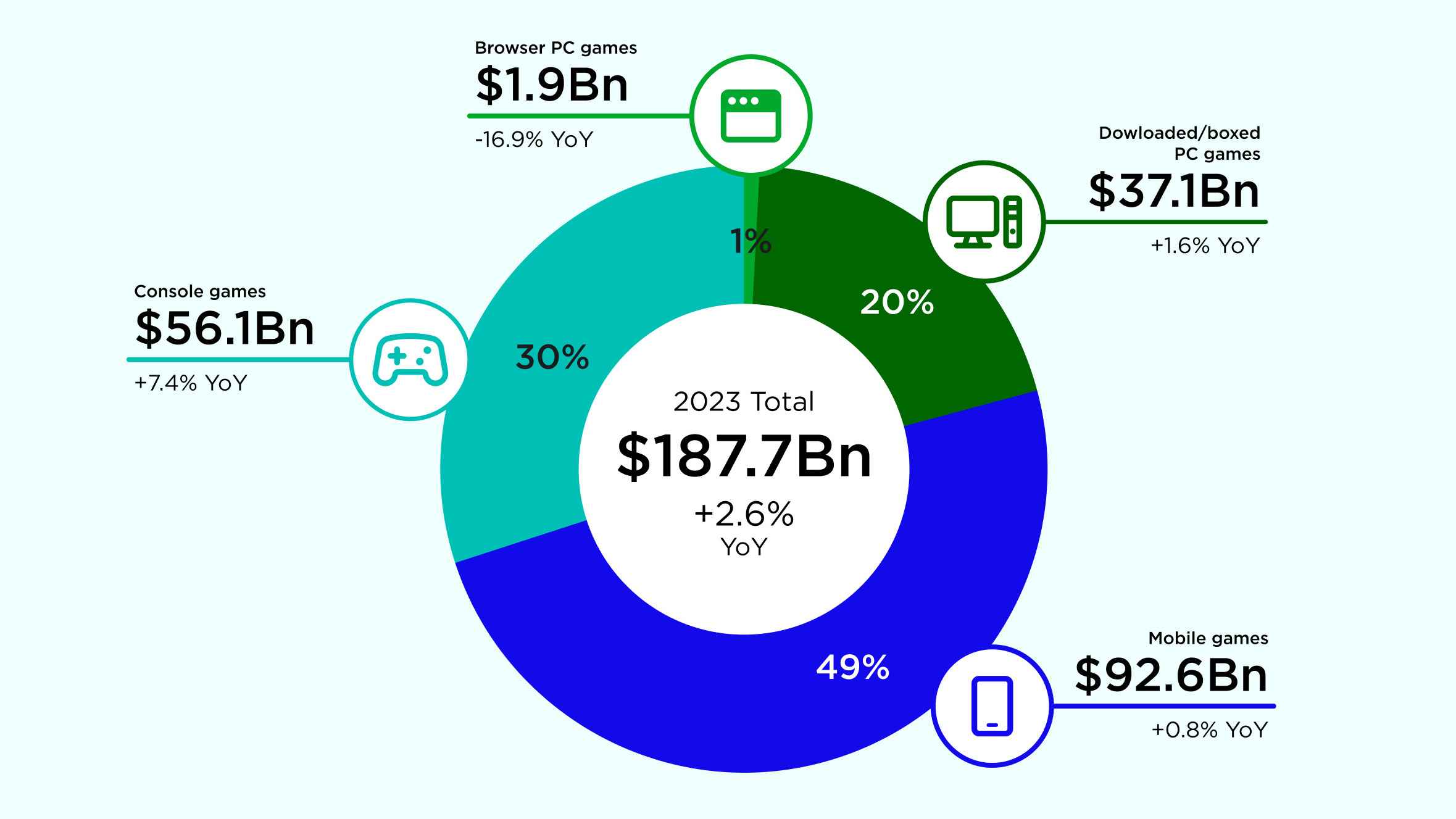 Nach dem Umsatzrückgang 2022 wächst die globale Spielebranche laut Newzoo 2023 wieder und soll bis 2026 ein Volumen von 212,4 Mrd. Dollar erreichen. Die einstigen Wachstumsmotoren Mobile Games und die Region Asien tragen dazu immer weniger bei.