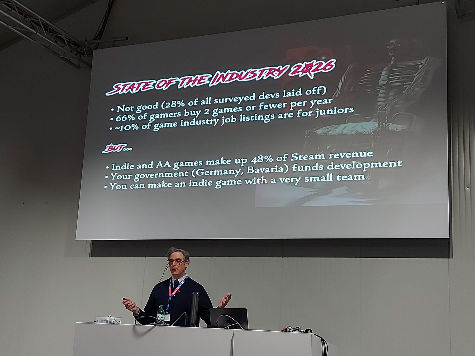 New 'games professor' Johanna Pirker at TUM opens her first DemoDay with a bang: Josh Sawyer from Obsidian held the keynote about working in small teams in front of a full hall of students. The DemoDay, organised by David Plecher, pitches students' theses, projects and game jam games every semester.