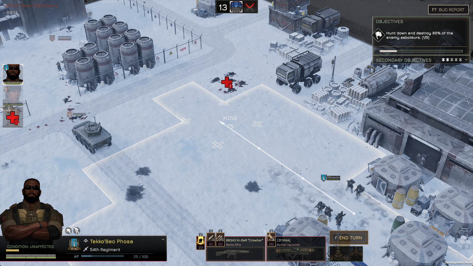 Once on the battlefield, players engage the enemy in turn-based tactical combat on procedurally generated maps whose components become familiar over time. Missions during an operation consist of 'rounds', during which all units on the battlefield can act before the next round begins. Unlike in other turn-based tactical games, there is no initiative system here. This means that any squad can move during their turn and no perks, abilities or weapons allow a squad to move before any other. Each faction must move all of its squads once before being able to use a prior one again in the next round. For example, it is possible to move a tank into position at the end of a round and then use it to attack at the start of the next round before the other units. This allows players to react flexibly to threats on the battlefield, but there are often several threats to consider. So, decisions are needed again.