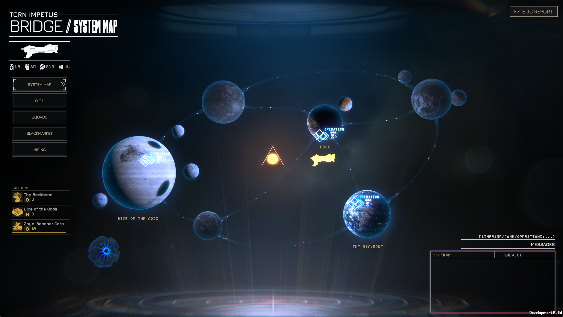 Each operation is procedurally generated and draws from a pool of up to ten mission types, connecting them through branching paths with different objectives. Missions within an operation can also affect subsequent missions in the same operation. The game is transparent, providing information on difficulty, logistics limits, descriptions, objectives and potential rewards. This allows players to determine which operation path to follow. To prepare for these missions, players can hire new squad leaders, access the Black Market for upgraded weapons and armour, and upgrade the Impetus to provide orbital support. However, at the beginning, almost everything is in short supply, so the aim is to gradually gain strength through the operations, repair the ship, and acquire new equipment.