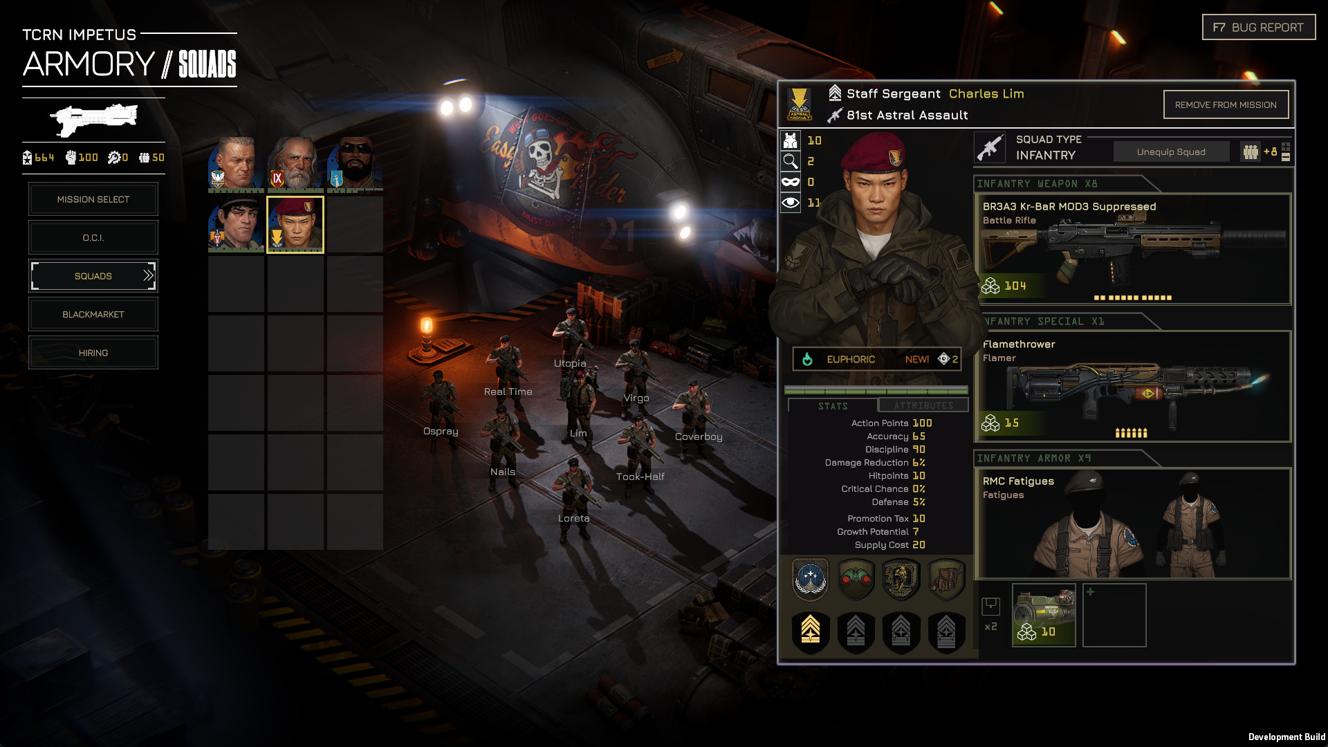 Armed squads can be sent from the Impetus to the surface of the chosen planet. These squads are made up of soldiers, each led by a Squad Leader. These squad leaders have their own personalities, backstories and unique perk trees, resulting in a diverse range of soldiers being deployed onto the battlefield. While some Squad Leaders command infantry squads, others are pilots who arrive on the battlefield in various vehicles. Leaders have individual backstories and moral decisions must be made from time to time between missions. While the characters are already well-developed, they are not quite as distinct as the characters from Jagged Alliance.