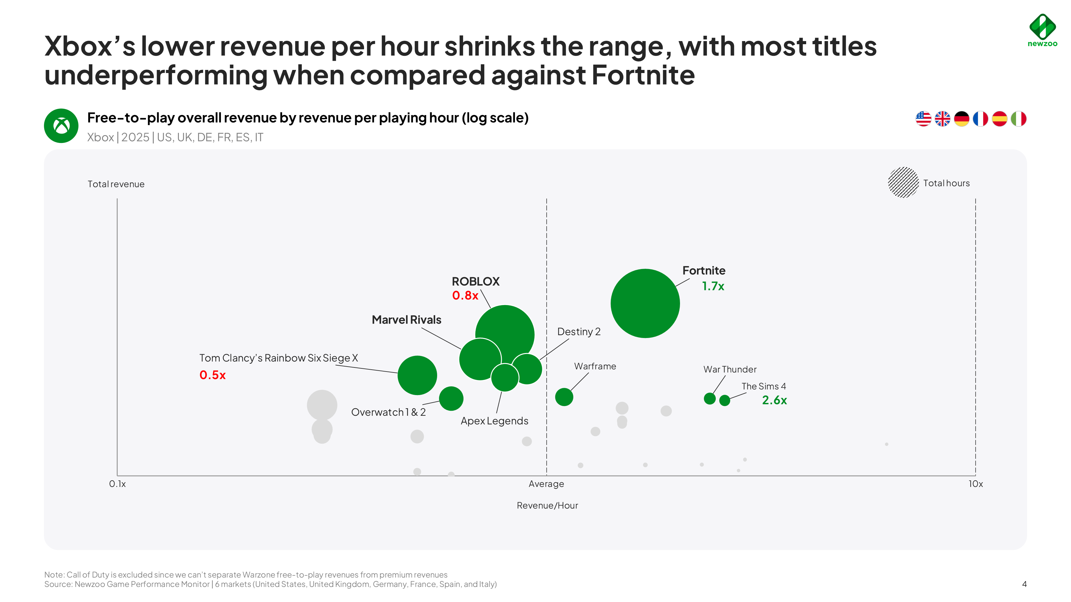 In fact, the data shows that playtime for free-to-play games has been declining across all three platforms under consideration: PC, PlayStation and Xbox. This is one of the reasons why the analysis focuses on the metric of revenue per hour played. And this shows that, for PC free-to-play games, revenue per hour played has risen by around 10%, whilst it is falling for PlayStation and Xbox games. Revenue per hour played on PC is also twice as high as on PlayStation and three times as high as on Xbox. However, Newzoo did not provide exact figures.