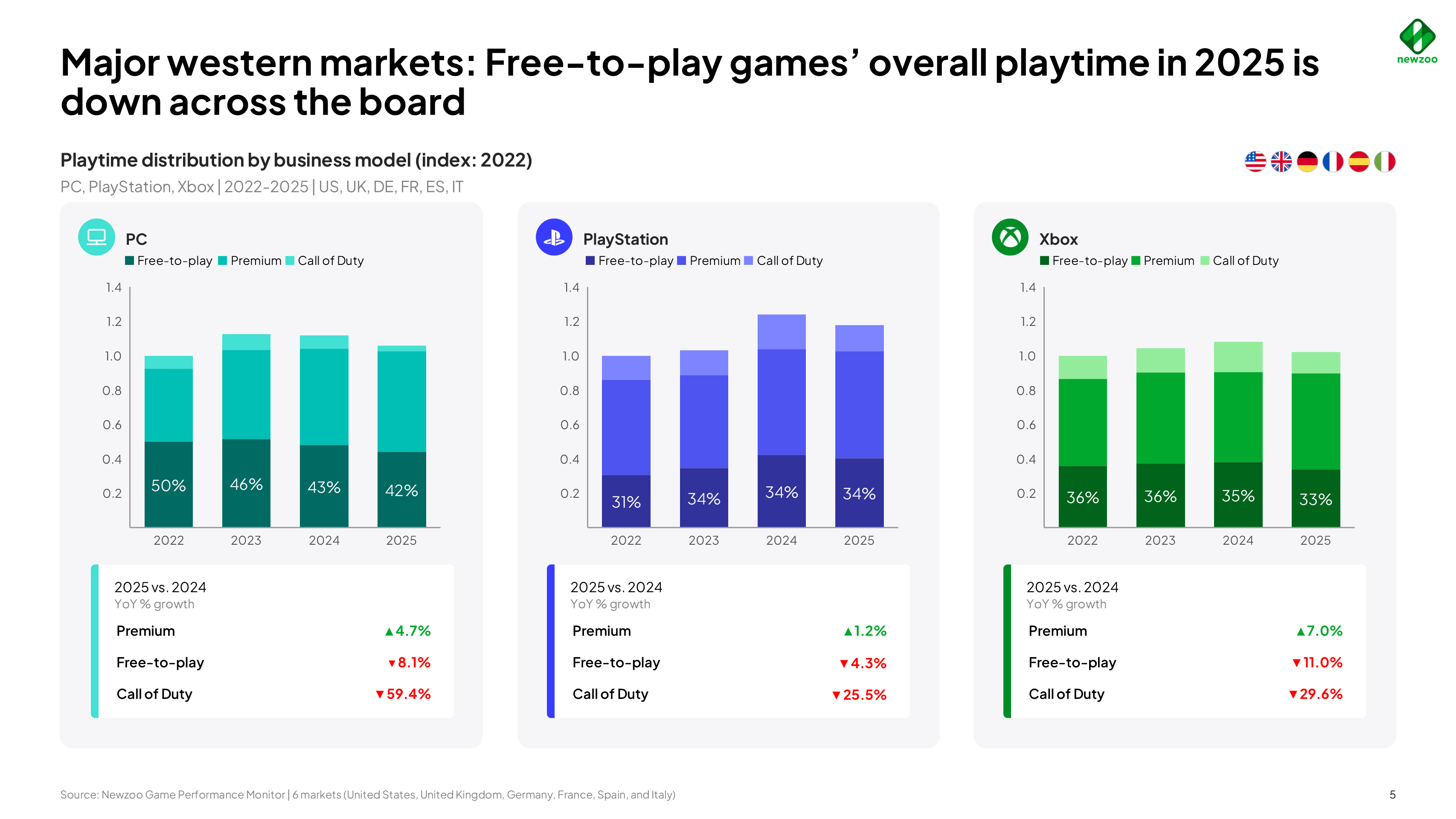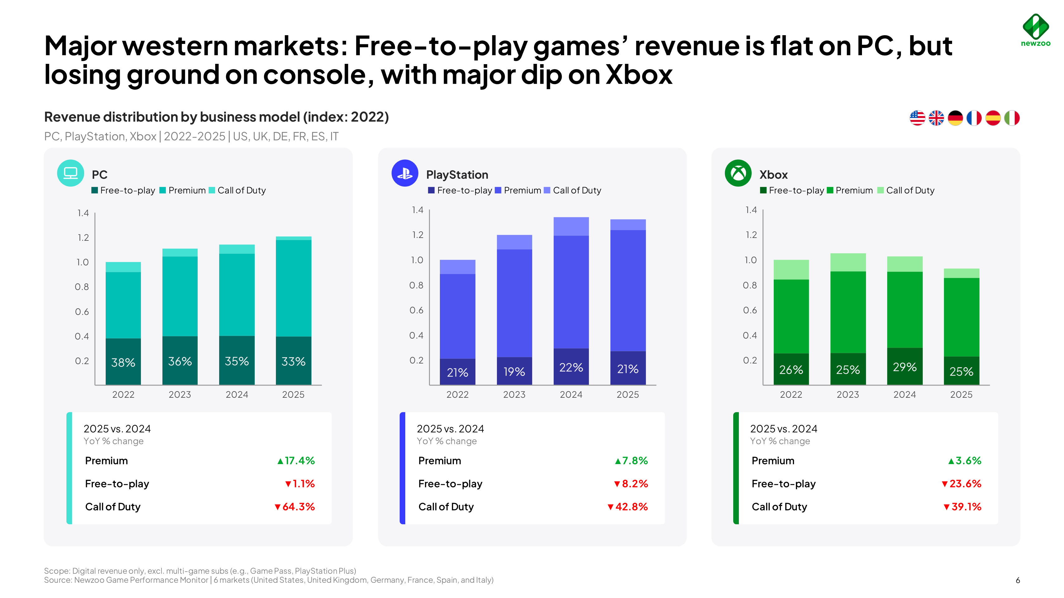 It should also be borne in mind that this is a sub-market analysis. The data analysed covered the largest Western markets, namely the US, UK, Germany, France, Spain and Italy. Furthermore, multi-game subscriptions were not taken into account. On consoles in particular, however, such subscriptions often include content packs for free-to-play games.