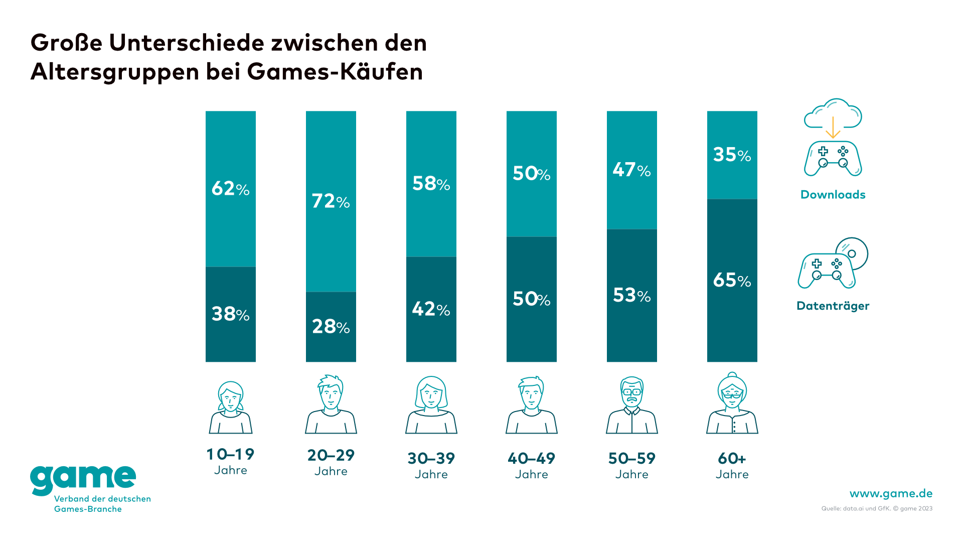 "Die jüngeren Spielenden in Deutschland greifen beim Spielekauf häufiger auf Downloads zurück, die Älteren setzen lieber auf Datenträger", resümiert der game. 72 Prozent der 20- bis 29-Jährigen kaufen plattformübergreifend ihre Games als Download. 50- bis 59-Jährige kaufen mehr als die Hälfte ihrer Games lieber als physische Kopien. Bei den über 60-Jährigen liegt der Anteil bei 65 Prozent.