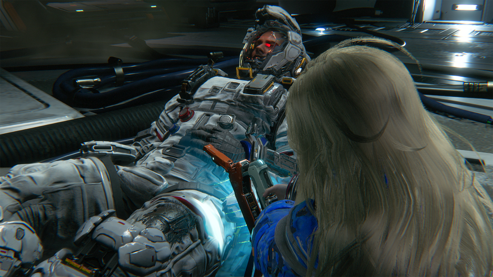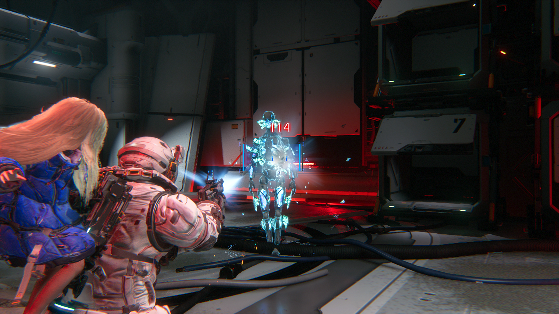 Teamwork is important when exploring the lunar research station. Hugh's suit has thrusters that allow him to move quickly and vertically around the base, while Diana can hack the security systems to unlock doors and clear the way forward. The more the player explores, the more weapons and hacking nodes they unlock, enabling them to customise their playstyle and combat approach. Additionally, any materials collected during combat and exploration can be used to upgrade equipment in order to take on stronger opponents.