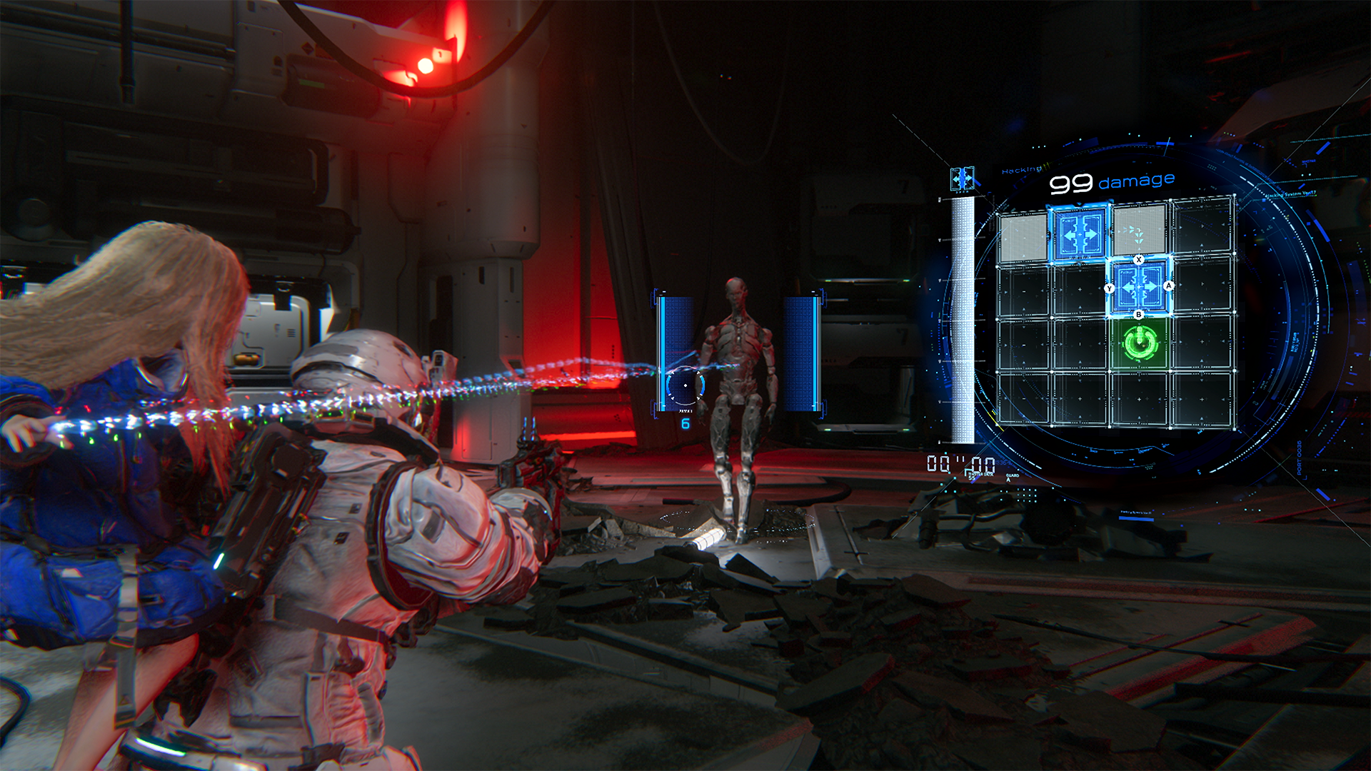 Hugh and Diana are controlled simultaneously. Diana uses her hacking skills to weaken enemies or make them vulnerable, which gives Hugh the chance to defeat them with his weapons. Hacking is not a passive element, but rather a central real-time combat mechanic. During these battles, a grid-based minigame similar to Snake appears, in which players must guide a cursor to the green target node. They can pass through optional nodes along the way to trigger additional effects, such as freezing or damage boosts. Hacking can take place in the middle of combat, even when an enemy is storming towards the player or they are dodging attacks. Hugh can also use his weapons to inflict crowd control effects on enemies, which gives him more time to weaken them. This system challenges players to adapt to different situations in the heat of battle.