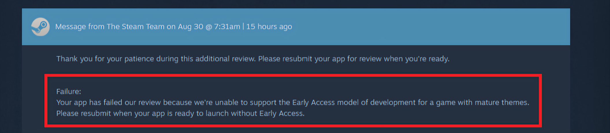 The issue was made public when developers of adult games shared the messages they received from Steam when trying to apply for Early Access. One of those developers is the studio Dammitbird, developers of the adult adventure game Heavy Hearts. “Due to current events, I panicked and contacted my publisher to help me get on Steam Early Access. The general rule is that your game should be about 65% done before doing EA. Well, we are about 70% done so the time was right anyway. But now, all of a sudden and without a policy announcement, the rules have changed and now I can't join Steam EA”, the developer explains in a statement to GamesMarkt.