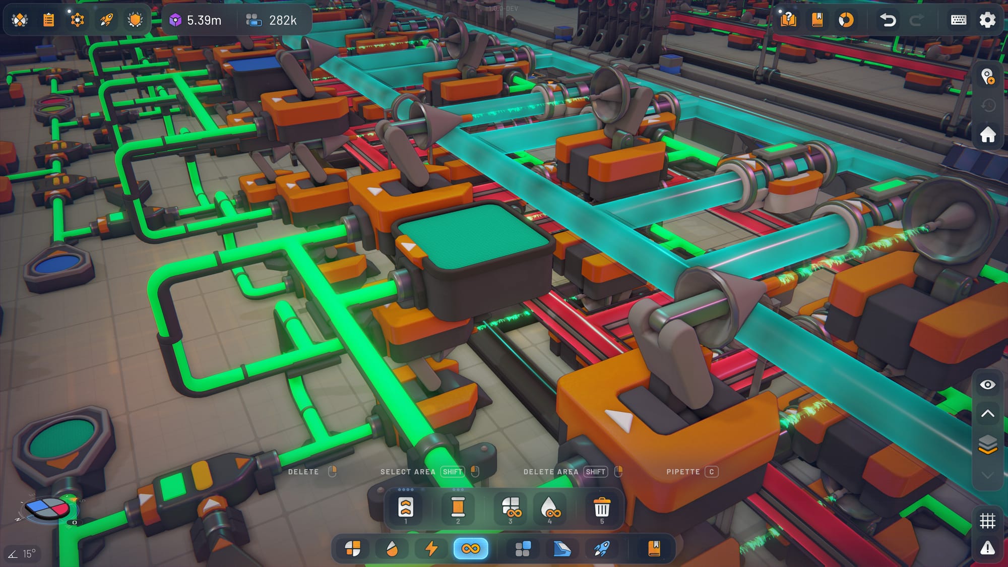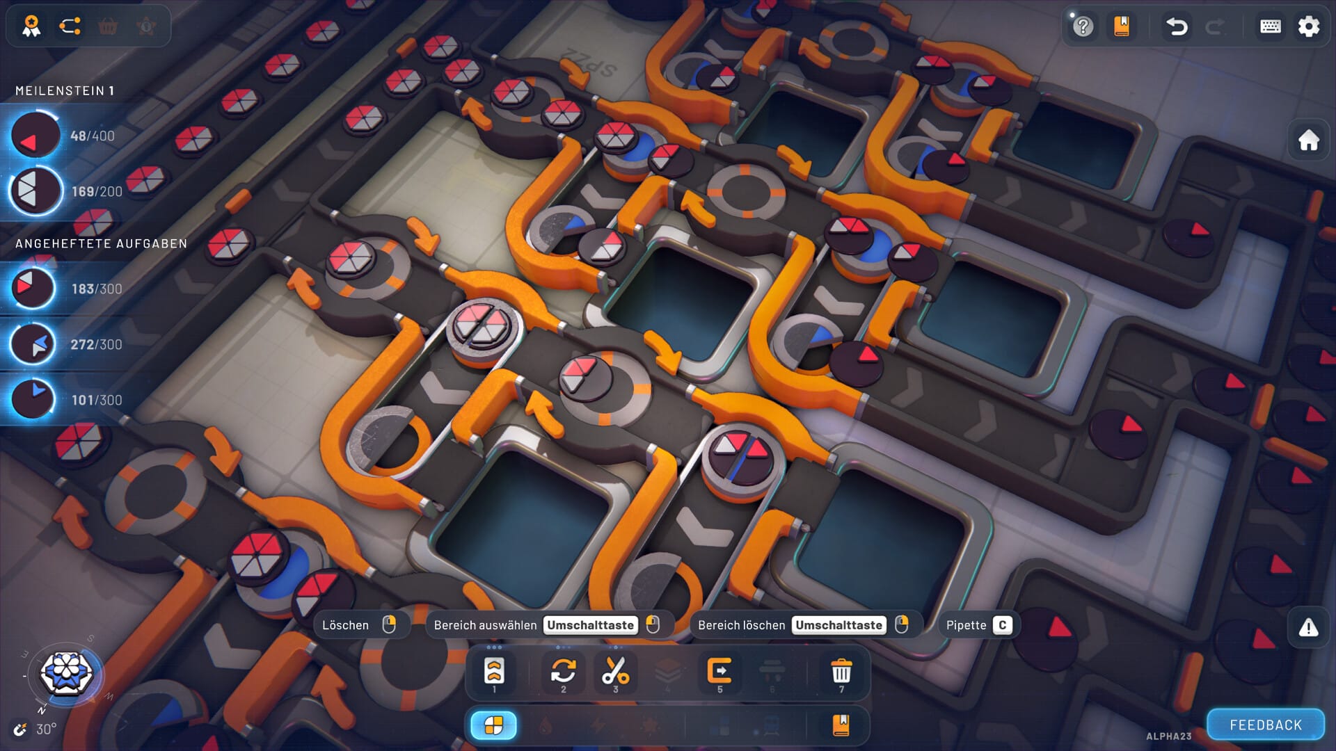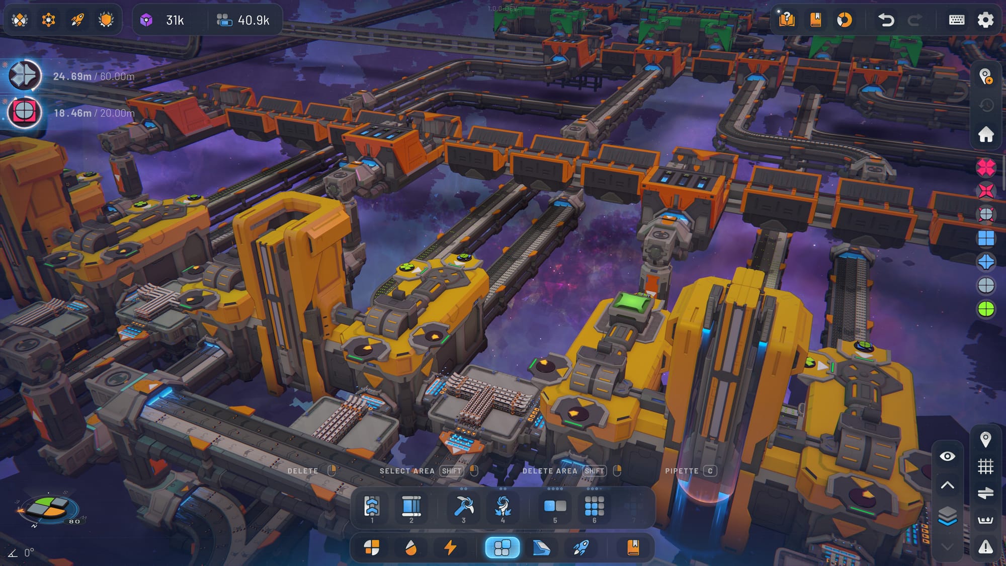 shapez 2, which added the title "Factory" during its Early Access period to make it clear what the game is about, sees players building sprawling automated factories in space to process geometric shapes through increasingly complex production lines. By cutting, stacking, rotating and painting shapes, players must design efficient logistics systems that can be scaled up to form massive industrial networks. As production demands increase, factories expand across multi-layered platforms, challenging players to continuously optimise and refine their automation. The factory grows from a single conveyor belt to a multi-station space factory connected by space trains. However, the game is much more abstract than Satisfactory or Factorio, as it does not produce recognisable products, but abstract shapes in different fluids (colours). Fluids and pipes are also a new addition compared to the first game.