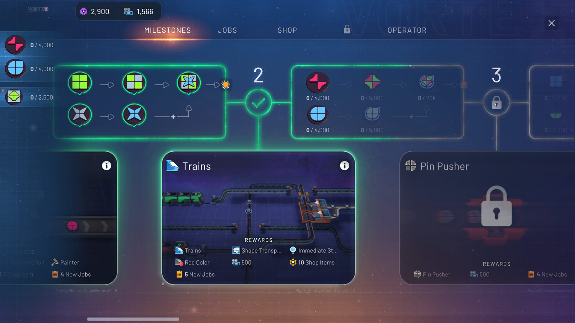 With version 1.0, however, Trade Stations from the Manufacture Mode, which will be introduced in the next paragraph, are added. Situated at the end of Classic Mode, the Trade Stations serve as an additional challenge, but differ from those in Manufacture Mode. "There are 5 milestones separated into 3 tiers of trade stations, starting from milestone 8 with Red, Green and Blue Trade Stations. Milestone 9 gives Cyan, Magenta and Yellow, mixed from the milestone 8 resources as you'd expect. Milestone 10 gives White and Black, which you'll need for the Vortex Grand Assembler that produces the shape you need for the final Milestone and the completion of the scenario," the developers explain. New additions include the two shapes (X and Y), which are used in Manufacture and Classic Modes (Trade Stations), as well as Vortex LTD lore elements, which have been added throughout the game. Quality of life changes have also been added, such as consolidating the speed upgrades into a global speed upgrade and making shape previews work more consistently. Pipes now have infinite throughput. However, they are still limited by the fluid launchers and catchers between platforms, which are now the main limiting factor. Trains have also been given a throughput buff, increasing their package size from 180 to 360 shapes, and from 1,800 to 3,600 litres.