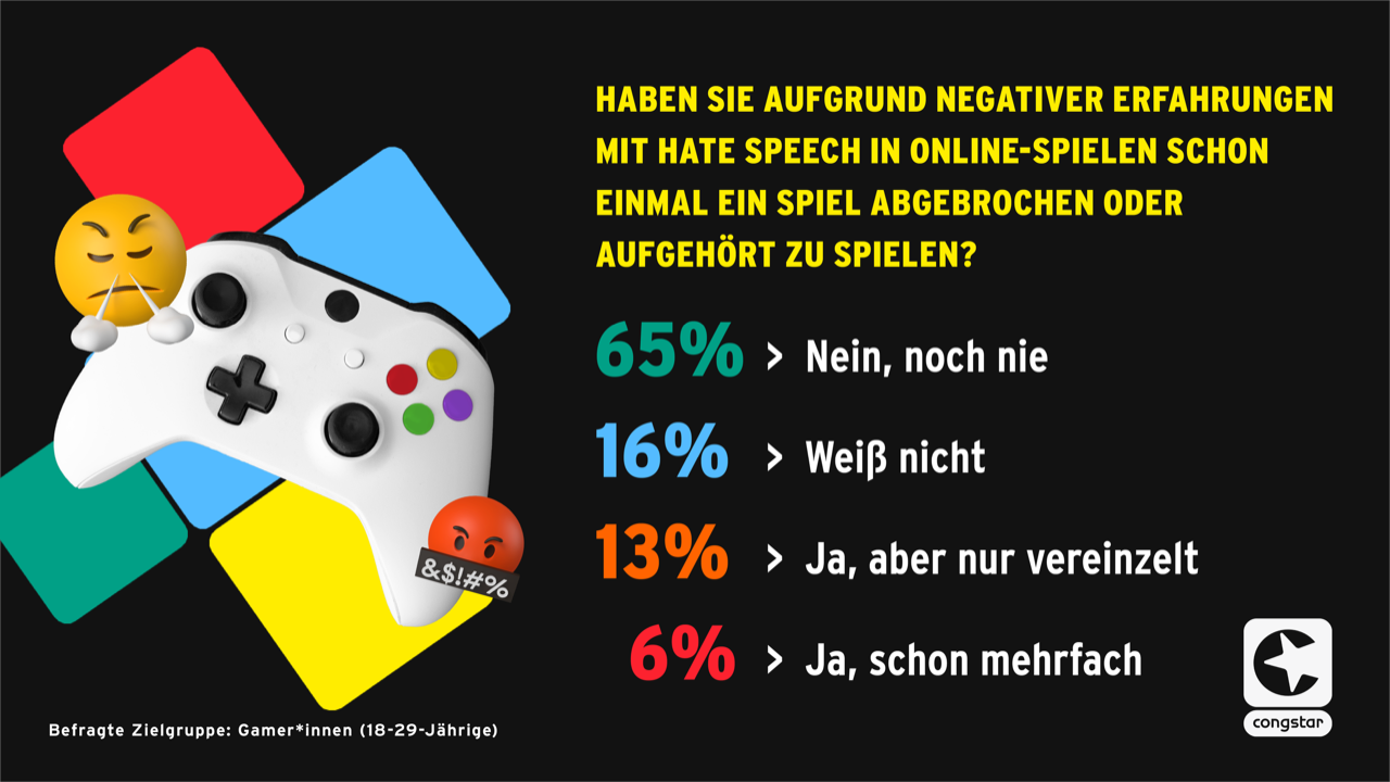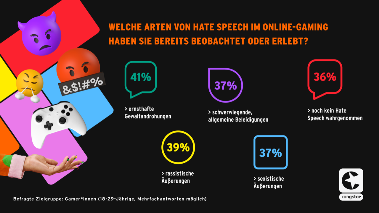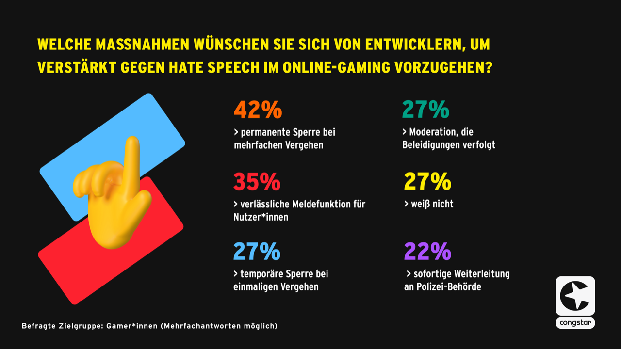 Eine Studie von congstar zu toxischem Verhalten und verbaler Gewalt beim Online-Gaming ergab, dass entsprechende Verhalten in den letzten Jahren zugenommen hätte. Gamer:innen wünschen sich permanente Sperren bei mehrfachen Vergehen, dicht gefolgt von einer verlässlichen Meldefunktion.