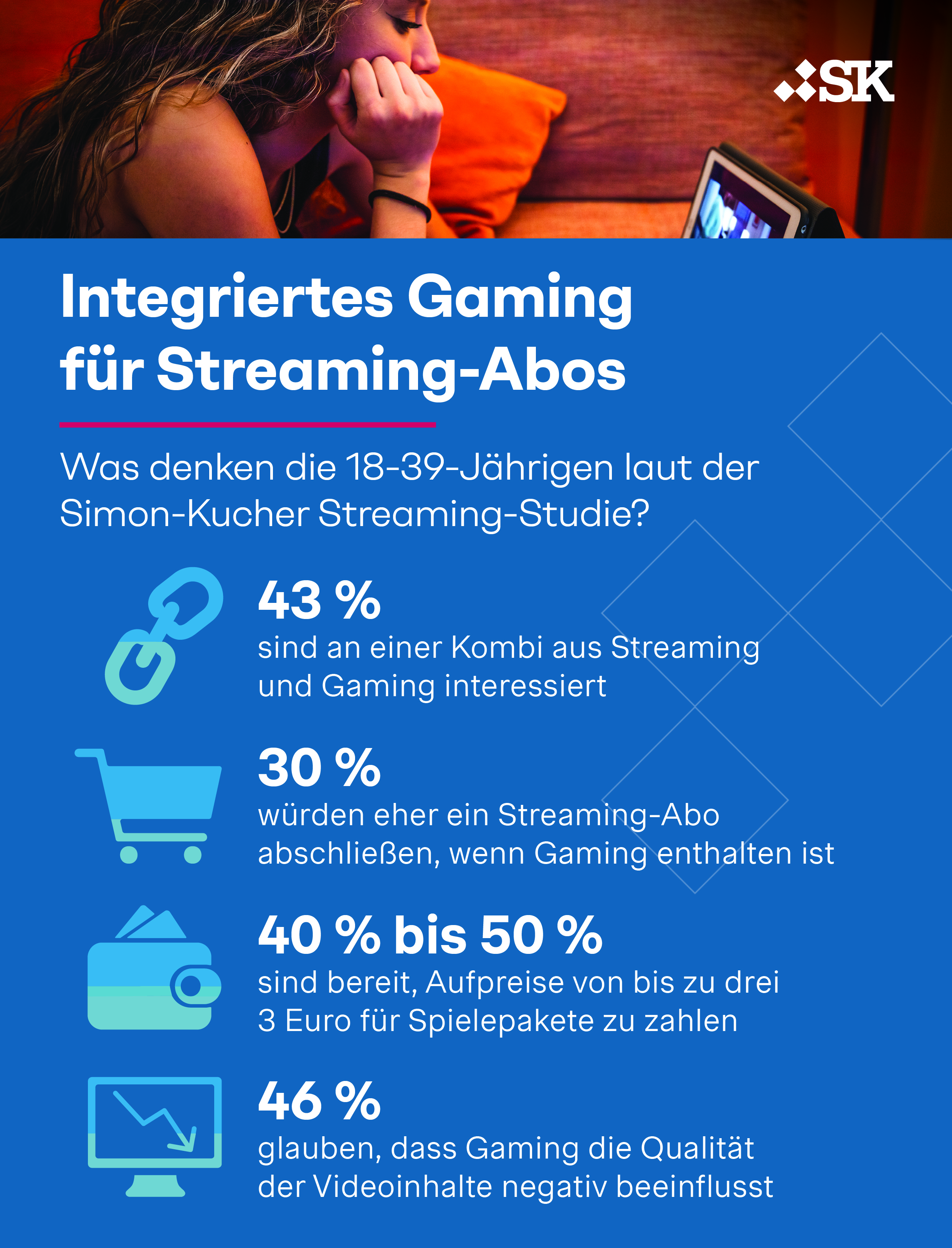 Die Kombination aus Streaming und Gaming wird von der Unternehmensberatung Simon-Kucher als "perfekte Kombi" angesehen. Laut einer Studie sind 43 Prozent der unter 40-Jährigen "eher bereit", ein Streaming-Abo abzuschließen, wenn Games enthalten sind. Bei den über 40-Jährigen ist jeder Fünfte interessiert.