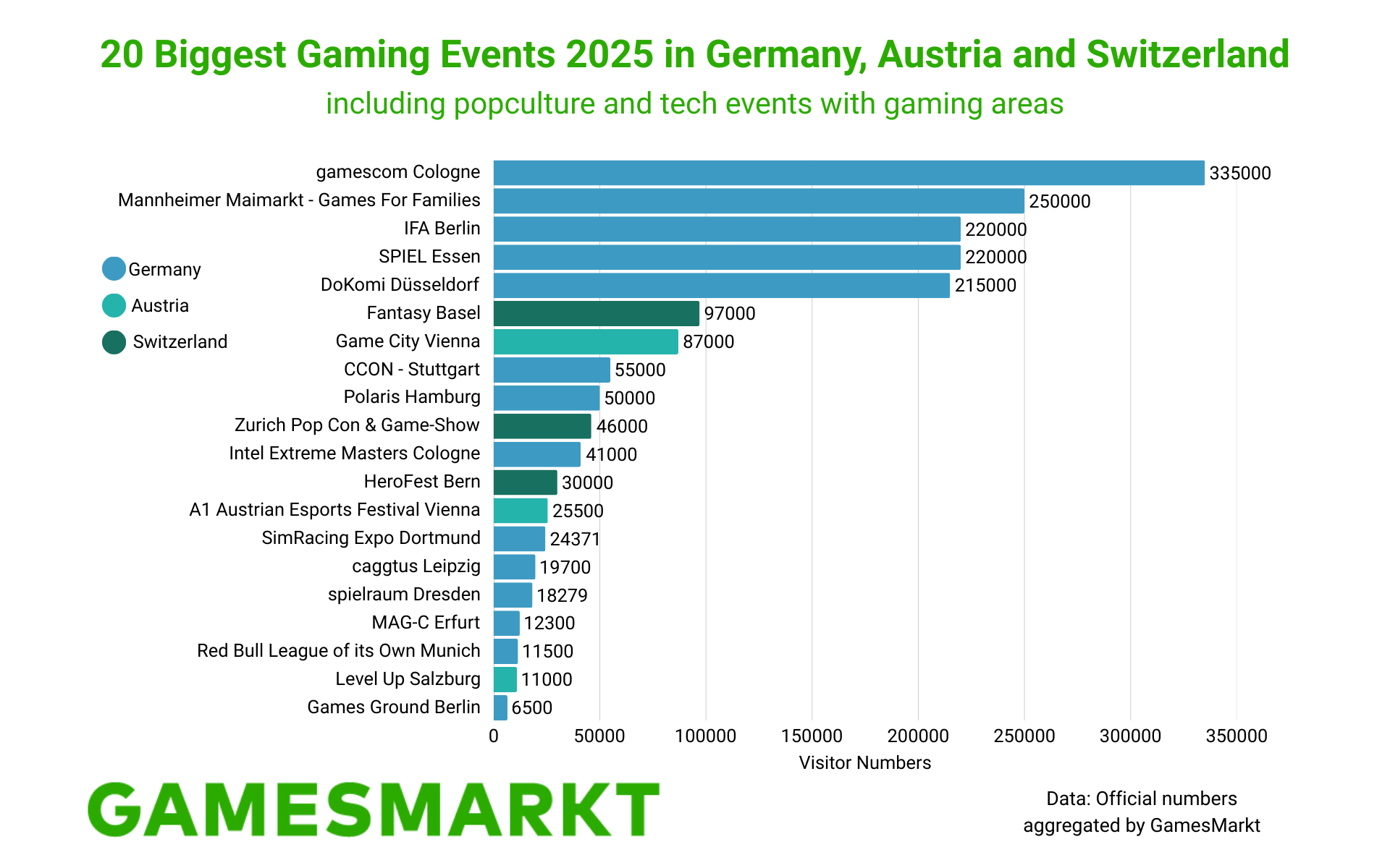 The 20 biggest gaming events in Germany, Austria and Switzerland 2025 by visitors numbers. Source: GamesMarkt.