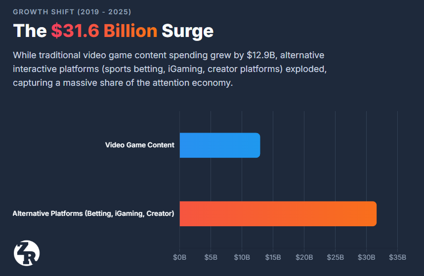 Between 2019 and 2025, American consumer spending on video game content grew by a respectable $12.9 billion. A solid number on the surface. However, during that exact same window, spending on alternative interactive platforms, specifically sports betting, iGaming, prediction markets, and creator monetization platforms like OnlyFans, exploded by $31.6 billion.