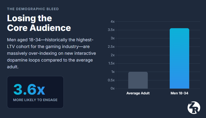 The core audience that has historically driven the gaming industry's most lucrative, highest-LTV franchises, men aged 18 to 34, is actively migrating. According to recent data on the state of the industry, this specific cohort is currently up to 3.6 times more likely to engage heavily with short-form video, prediction markets, and crypto trading than the average adult.