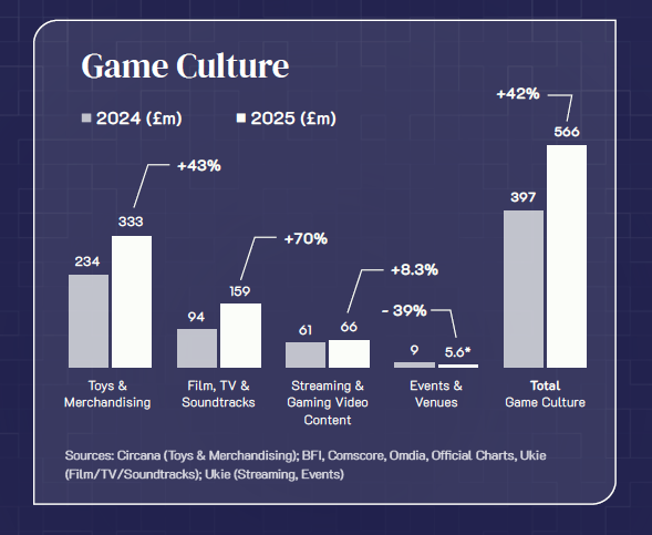Finally, it is also interesting to note the trend in a segment reported exclusively by UKIE: the ‘Game Culture’ sector. Here, the association includes revenue from merchandise, as well as soundtracks and books, film and TV licences, game streaming content and events. Overall, revenue in this sector rose by 42% to £566 million, or around €649.6 million. More than half of this comes from the toys and merchandising business.