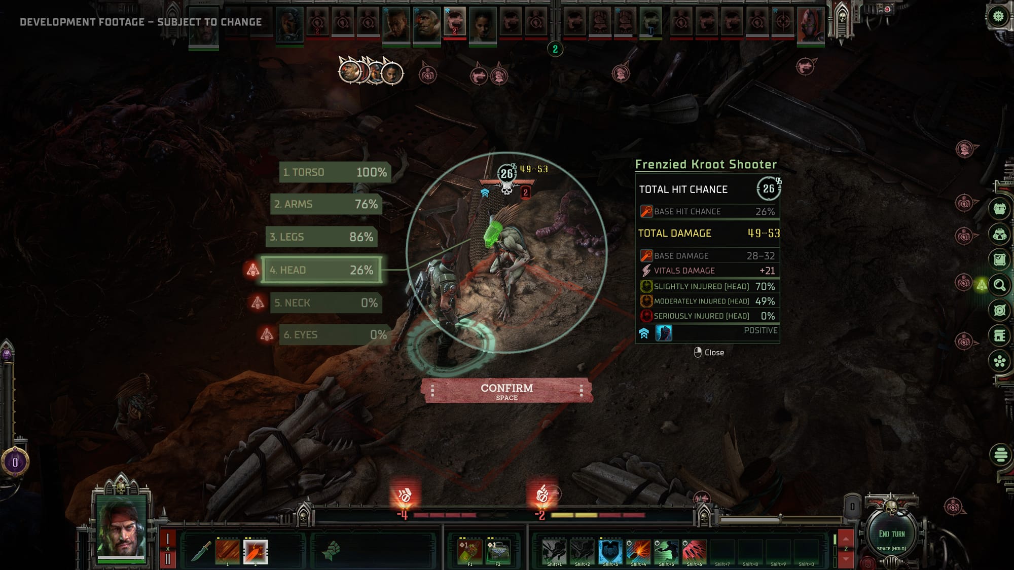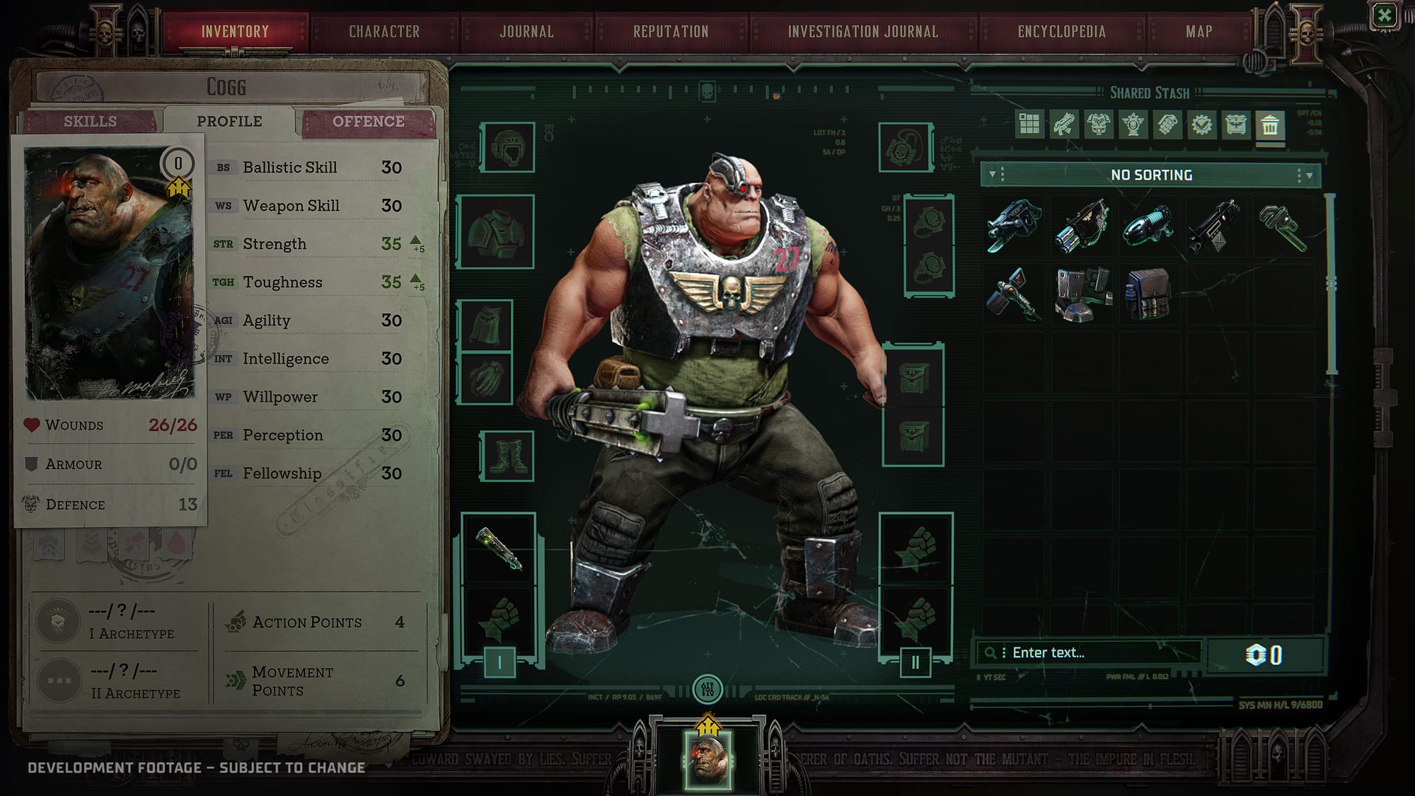 The features of the alpha version are described as follows: "In the alpha, players will team up with several acolytes of the Inquisition - and even some Xenos, if that's what it takes to pursue their ambitions. Among the group of available companions are a Kroot outcast, a deadly Medicae specialist, an Ogryn with higher than average intelligence, and more. With 10-15 hours of estimated playtime in the alpha, players will learn the basics of the revamped combat system, get to know the ins and outs of the Inquisition and uncover mysteries with the new detective system. As part of the Holy Orders of the Emperor's Inquisition, players must look for clues, interrogate suspects and come to conclusions - and woe betide those found guilty!"