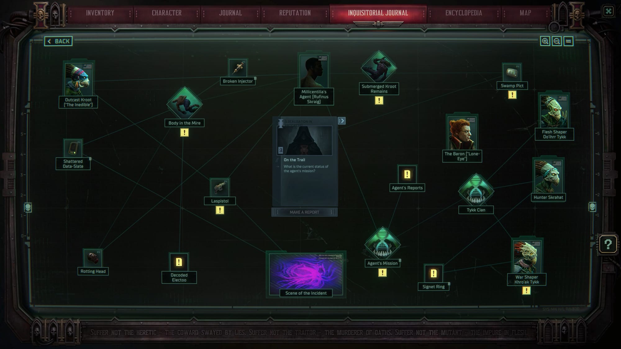 Apart from the in-depth conversations with choices and consequences, and the turn-based combat system, the biggest difference between Rogue Trader and Dark Heresy is the investigation system. To get to the bottom of what is going on and who is involved, the player gathers information through conversation and investigation of the environment, making decisions along the way. A kind of mind map helps to record and organise the information. The game world reacts to the player's decisions about who is guilty and who is not. Characters remember who is accused, who is spared and how they behave. Storylines and even the environment itself will be altered by the consequences of these actions.