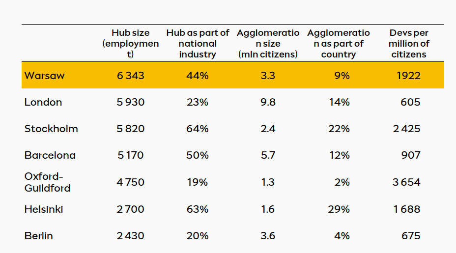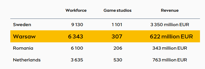 An interesting comparison from the report is the comparison of Warsaw with the games industry of entire countries. According to the report, if Warsaw were a country, it would rank roughly on a par with Romania, behind Sweden and ahead of the Netherlands.